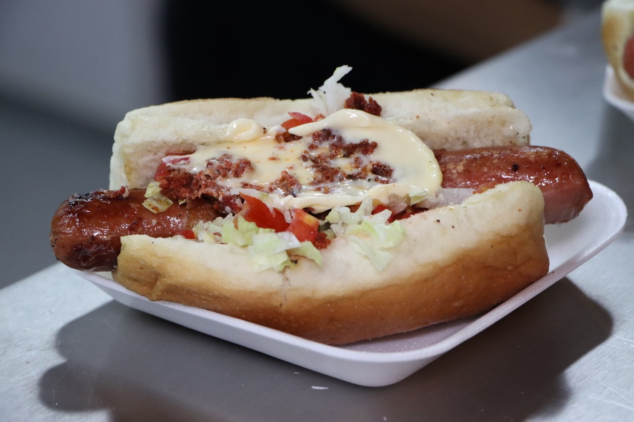 Preparado con salchicha asadera rellena con una winnie con queso chihuana envuelta con tocino incluye lechuga, tomate, chorizo y mayonesa.