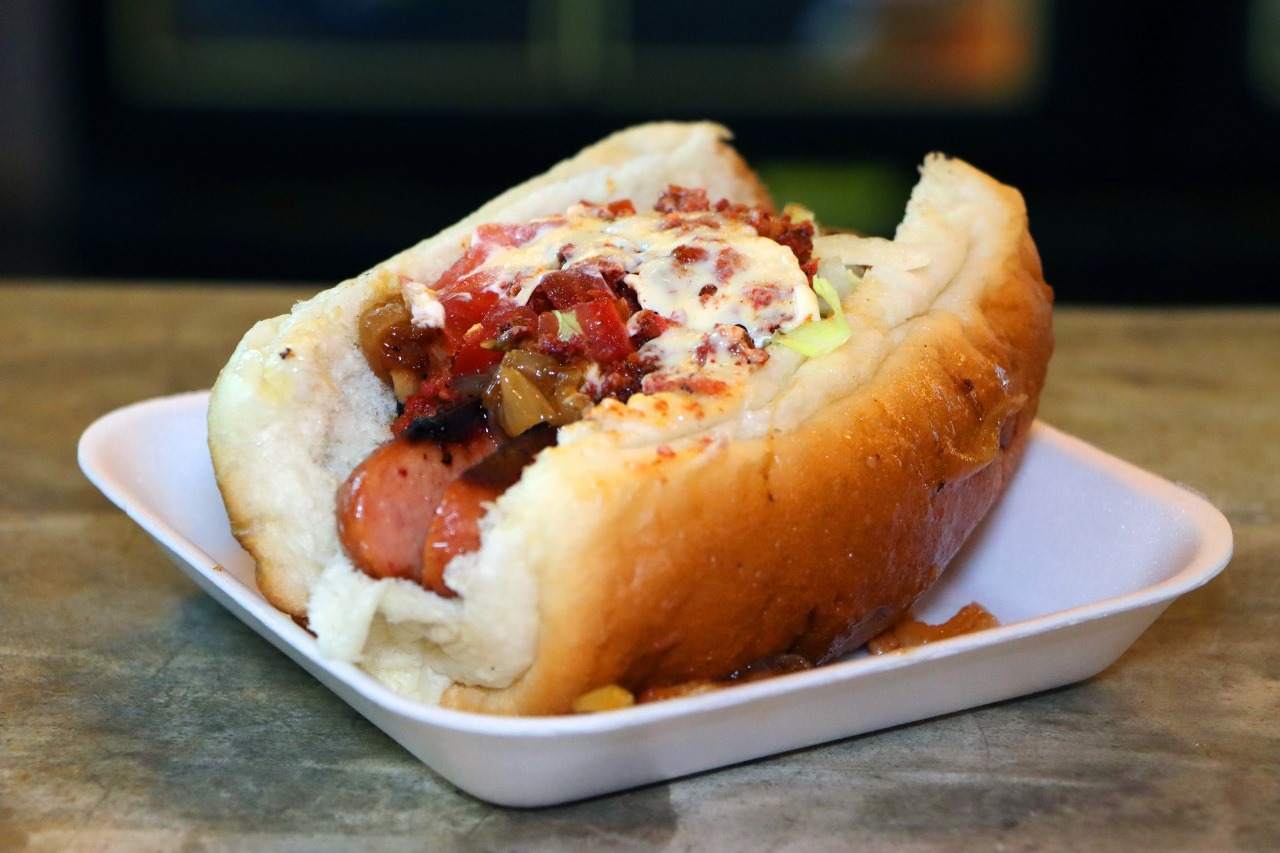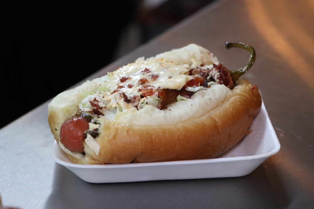 Preparado con chile anaheim relleno con un winnie rellena de queso chihuahua y envuelto con tocino incluye lechuga, tomate, chorizo y mayonesa.