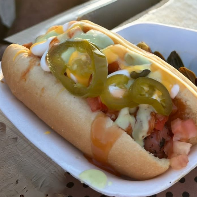 pan, salchicha rellena de queso chihuahua, tomate cebolla capsu mostaza mayonesa y crema
