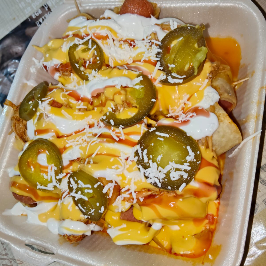 salchicha enrollada en tortilla cortada en trozos frita con carne de pierna, chiles, crema queso amarillo capsu queso seco