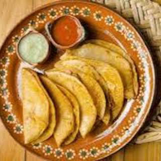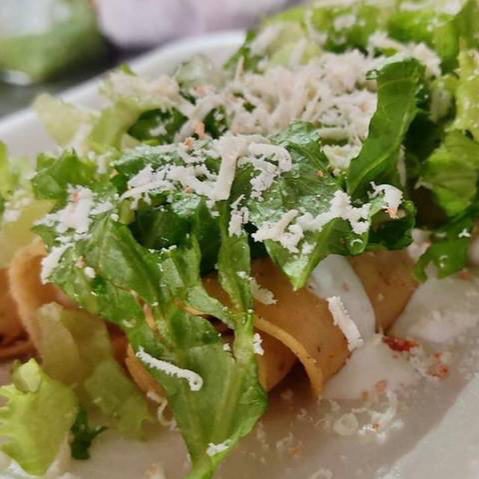 Rico taco dorado de papa con chorizo, acompañado con lechuga, crema y su deliciosa salsa de la casa.
