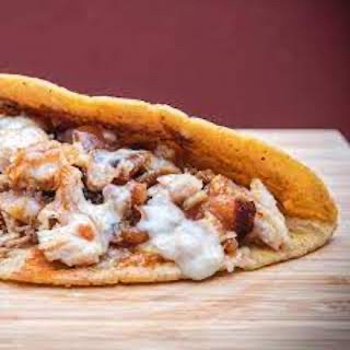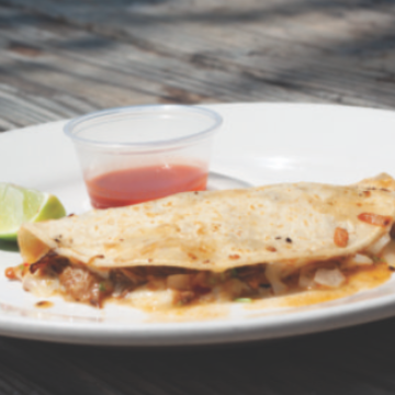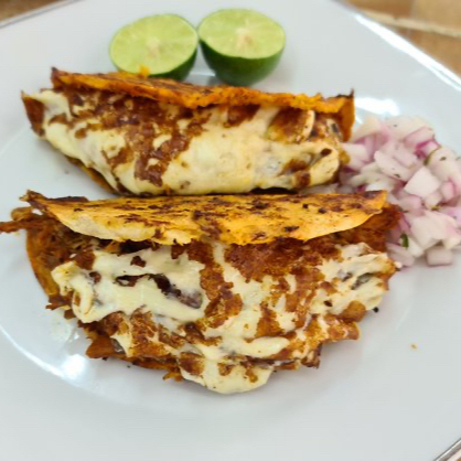 Rica quesabirria de maíz acompañada de cebolla, cilantro y deliciosa salsa de la casa .