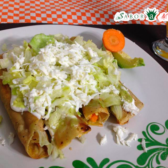 Rica flauta de papa con chorizo de 15cm. de largo, acompañada de crema, lechuga y deliciosa salsa de la casa.
