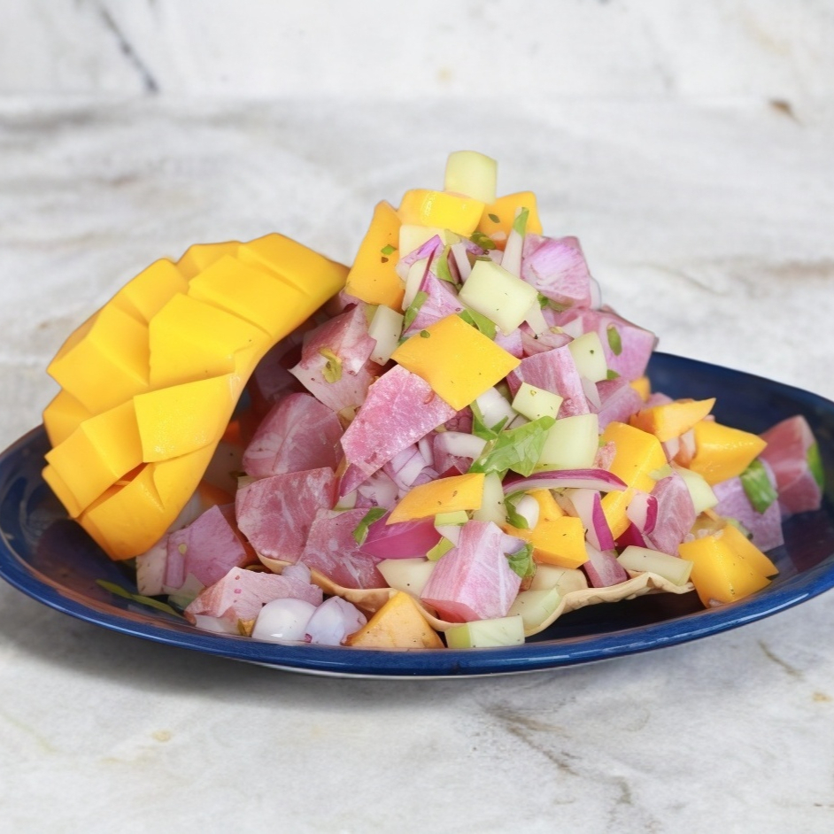 Cubos de medallón fresco de atún, mango y aguacate con la salsa primavera de la casa.