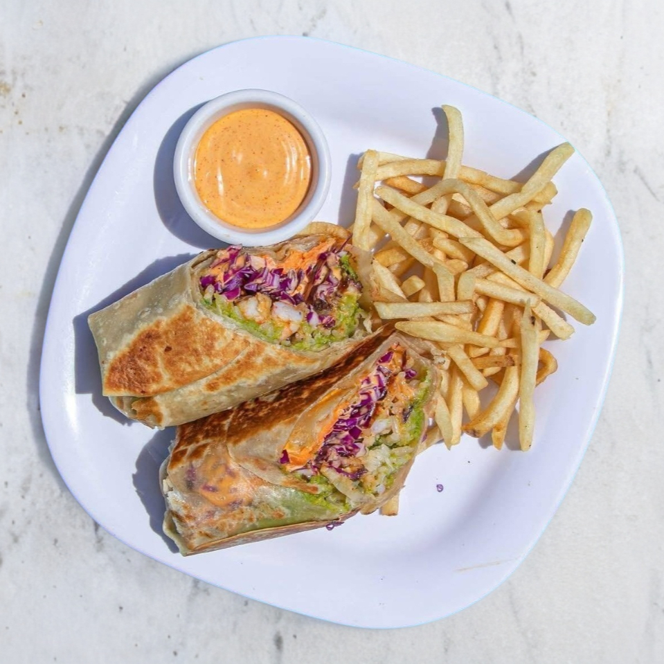 3 piezas. Capeado de camarón, acompañado de arroz, lechuga, guacamole y aderezo de sriracha.