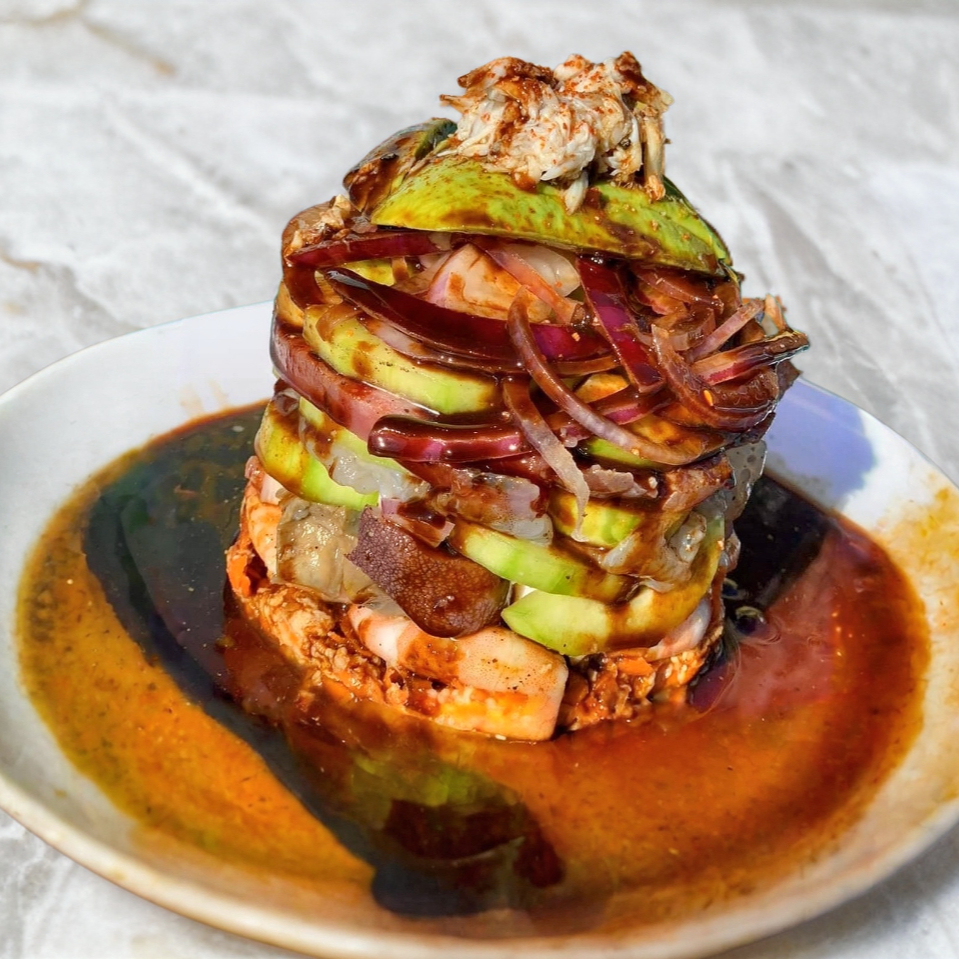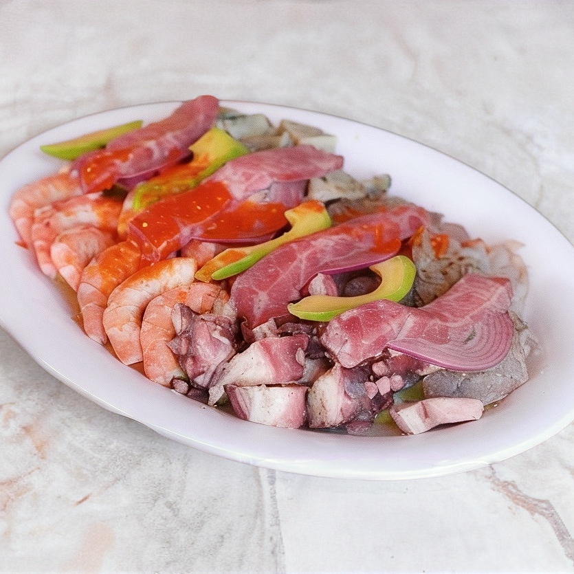 Camarón cocido mariposa, pulpo, pescado fresco del día, caracol en salsa cevichera de la casa, coronado con pulpa de jaiba.