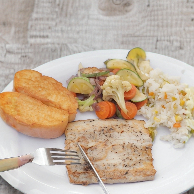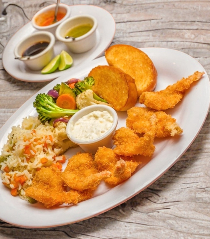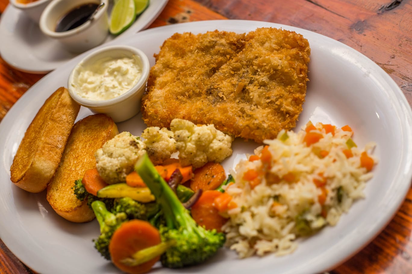 Acompañado de arroz, mezcla de vegetales asados y salsa tártara.