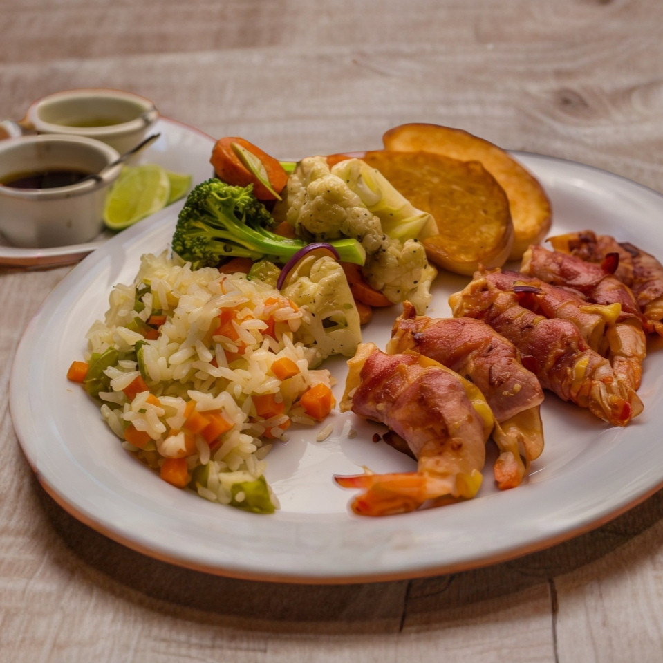 Envueltos en tocino, acompañados de arroz, mezcla de vegetales asados.
