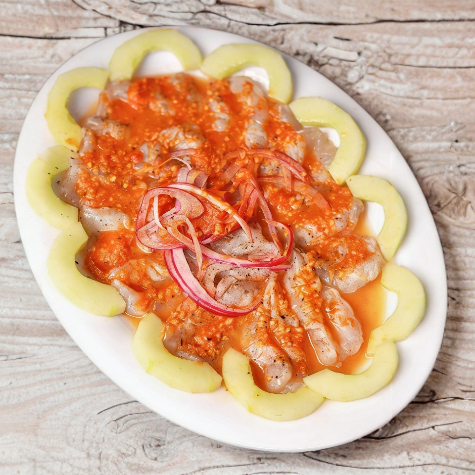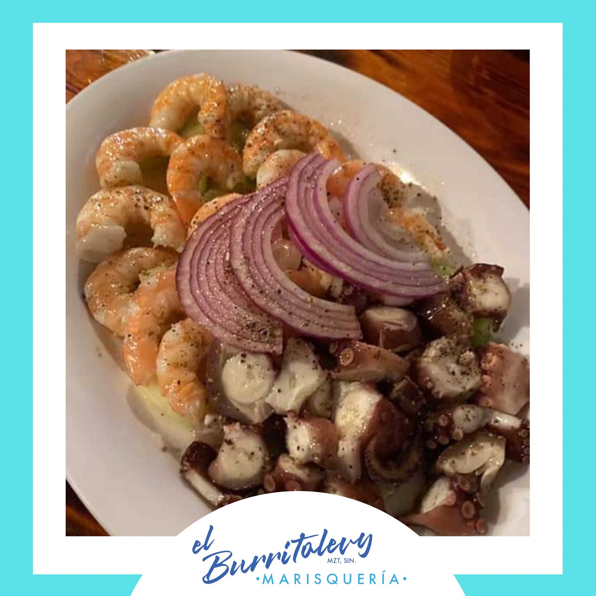 Pulpo, camarón mariposeado crudo, cocido, seco, pepinos en media luna, salseado negro de la casa.