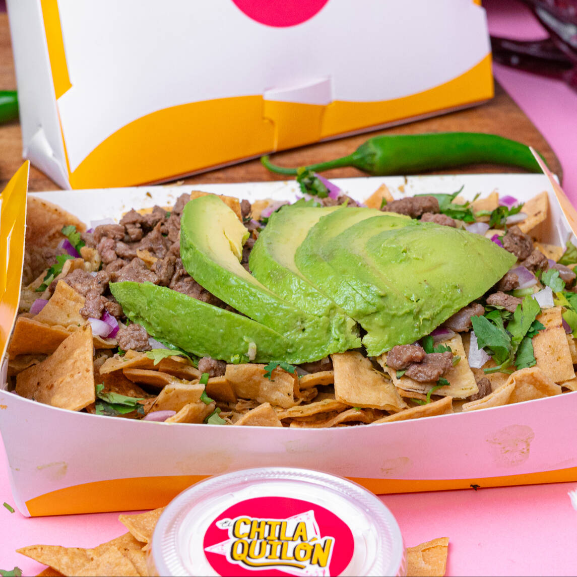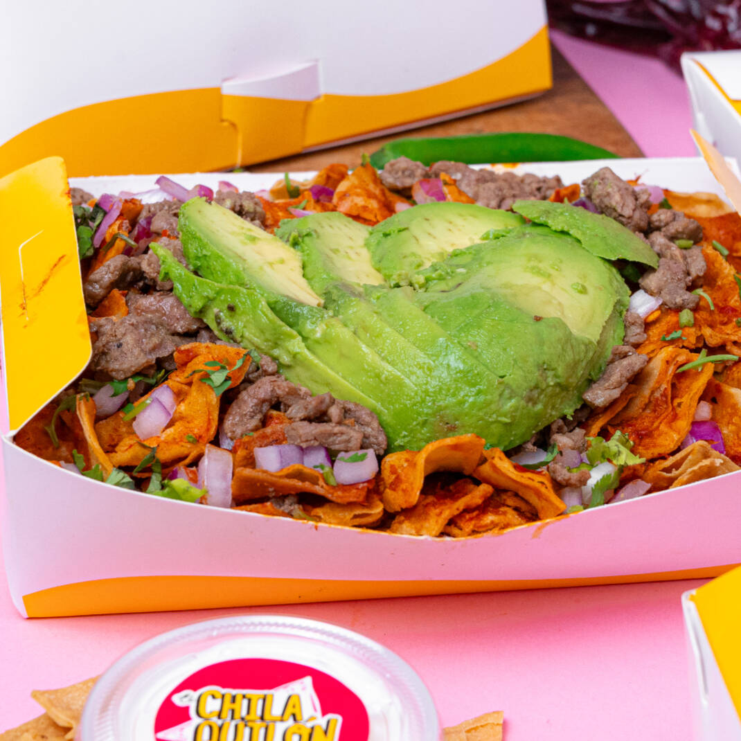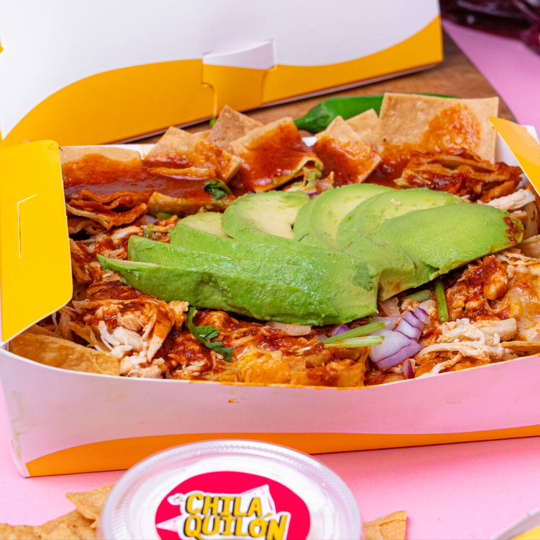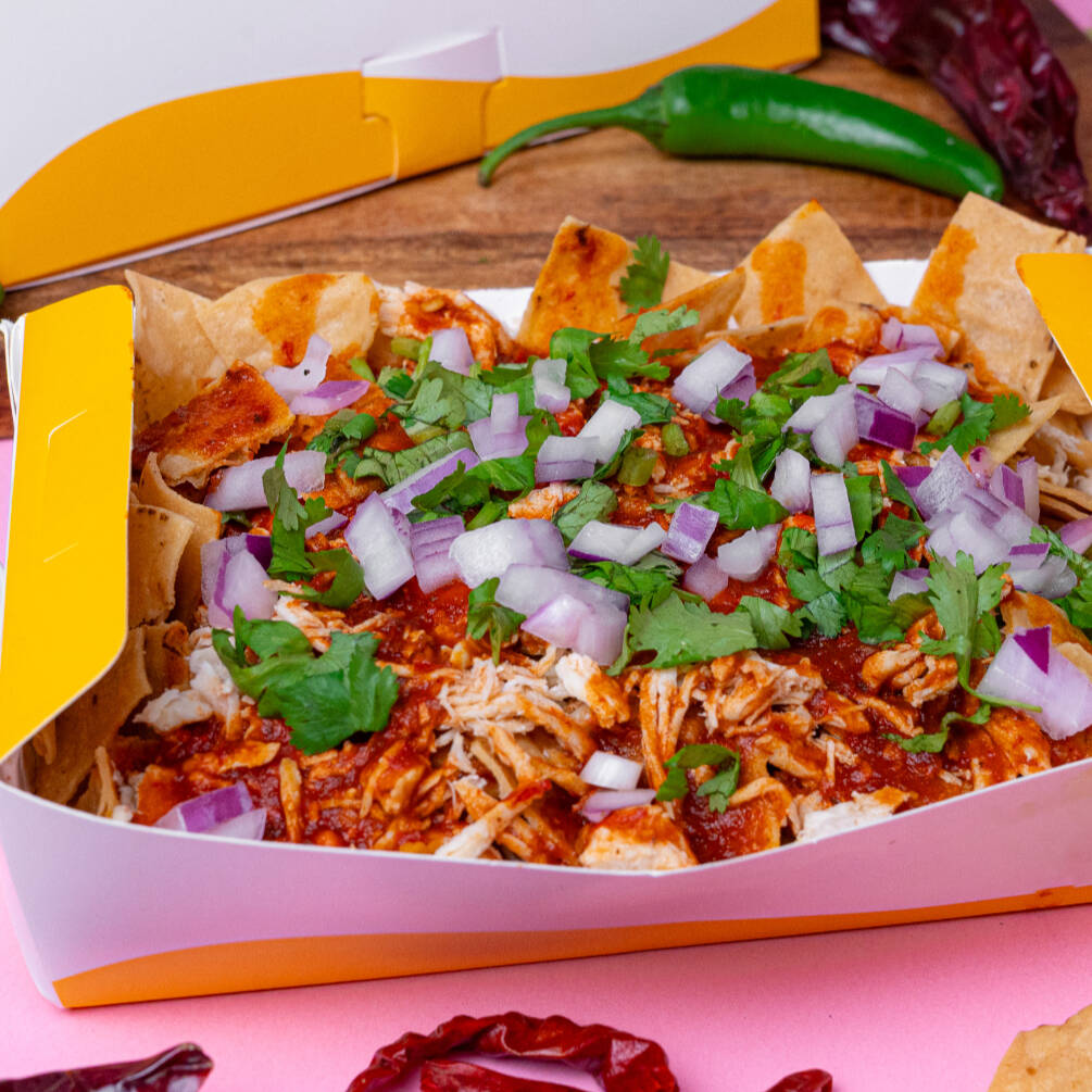 Medio litro de chilaquiles con nuestra salsa rojona con un toque de chipotle, coronada con pollo, aguacate, queso derretido, su cilantro, cebolla. lleva su crema a parte.