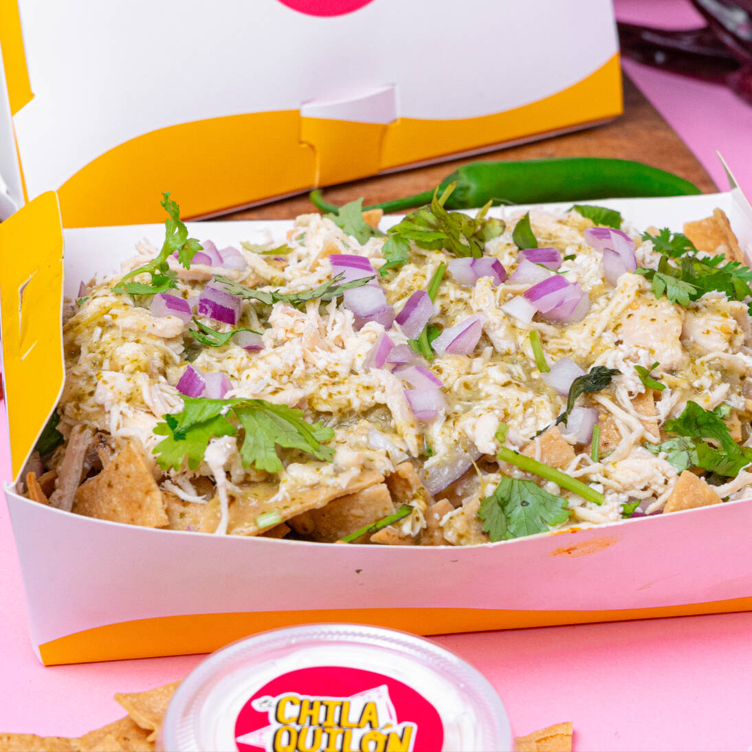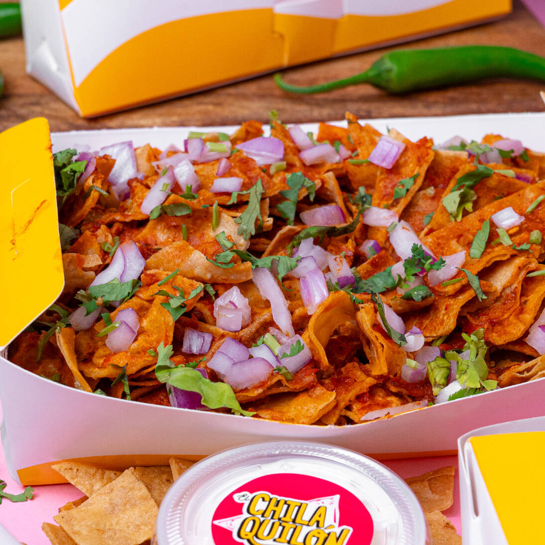 Medio litro de chilaquiles con nuestra salsa rojona con un toque de chipotle picosito, cilantro, cebolla y su crema a parte.