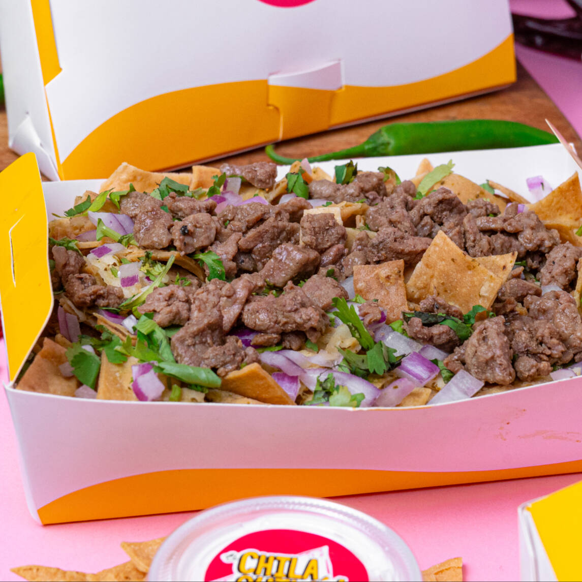 Medio litro de chilaquiles con nuestra salsa rojona con un toque de chipotle, coronada con top sirloin en cubos, queso derretido, su cilantro, cebolla. lleva su crema a parte.