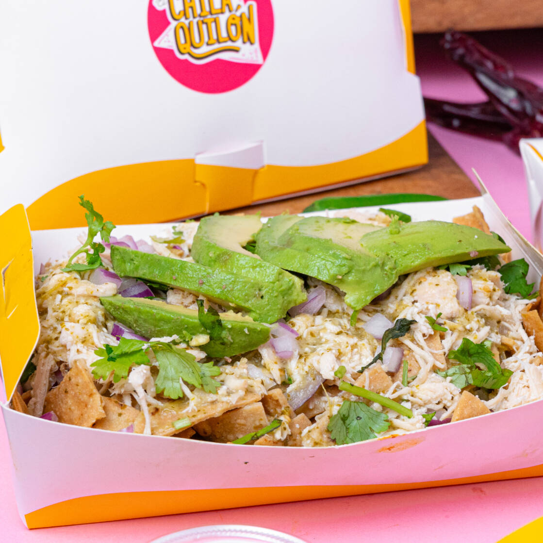 Medio litro de chilaquiles con nuestra salsa a la verde picosita, coronada con pollo y aguacate, queso derretido, su cilantro, cebolla. lleva su crema a parte.