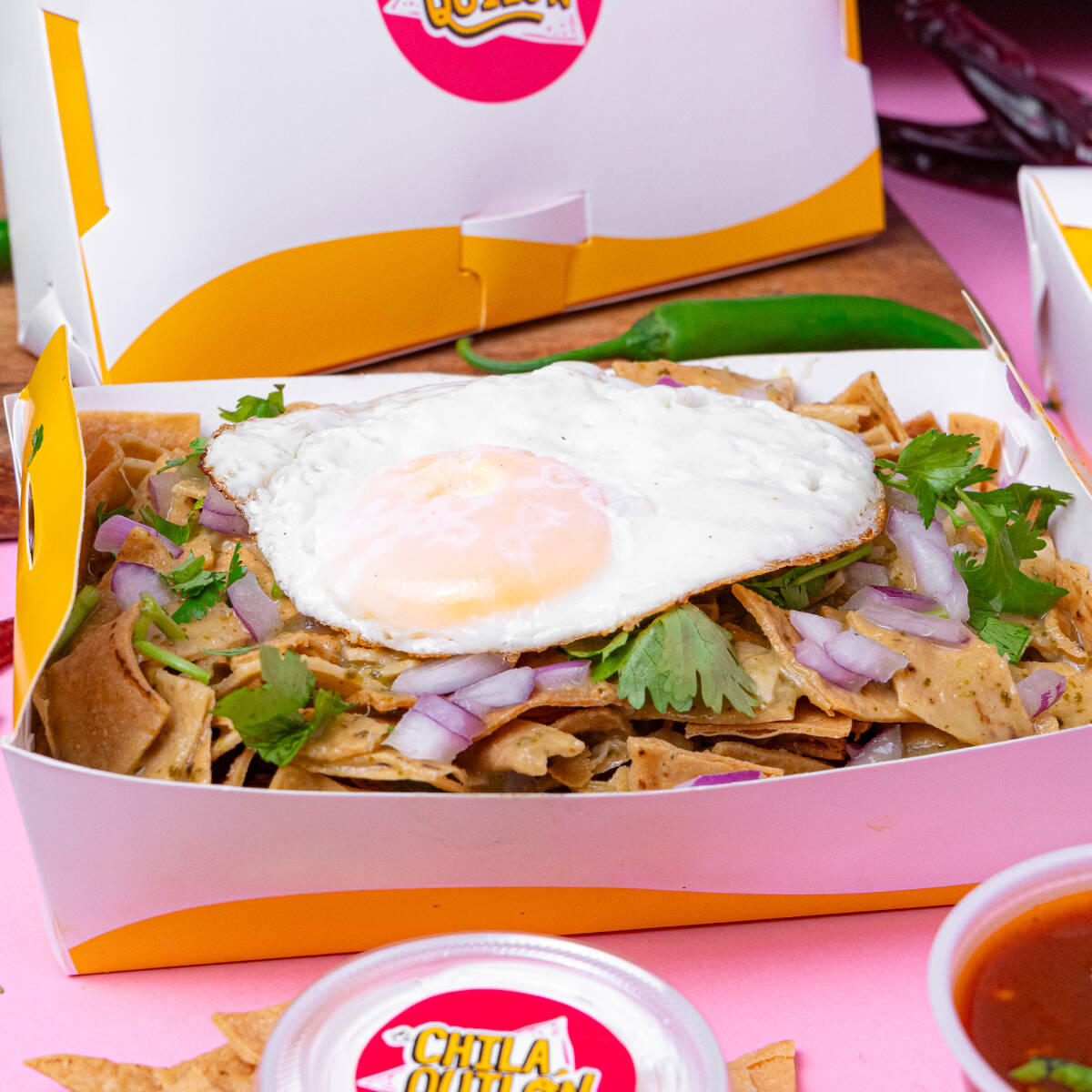 Medio litro de chilaquiles con nuestra salsa rojona con un toque de chipotle, coronada con huevito, queso derretido, su cilantro, cebolla. lleva su crema a parte.