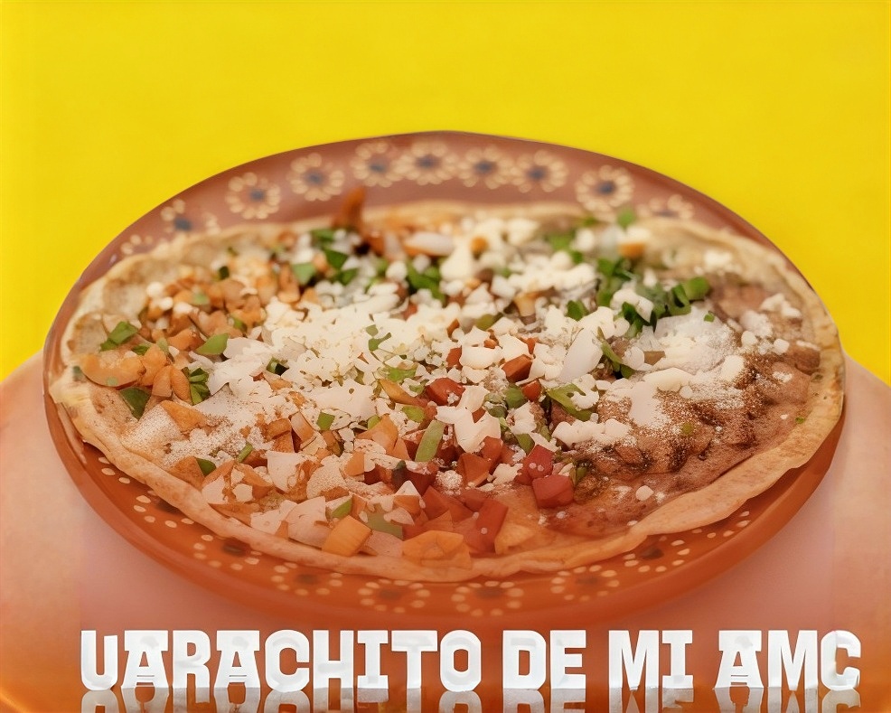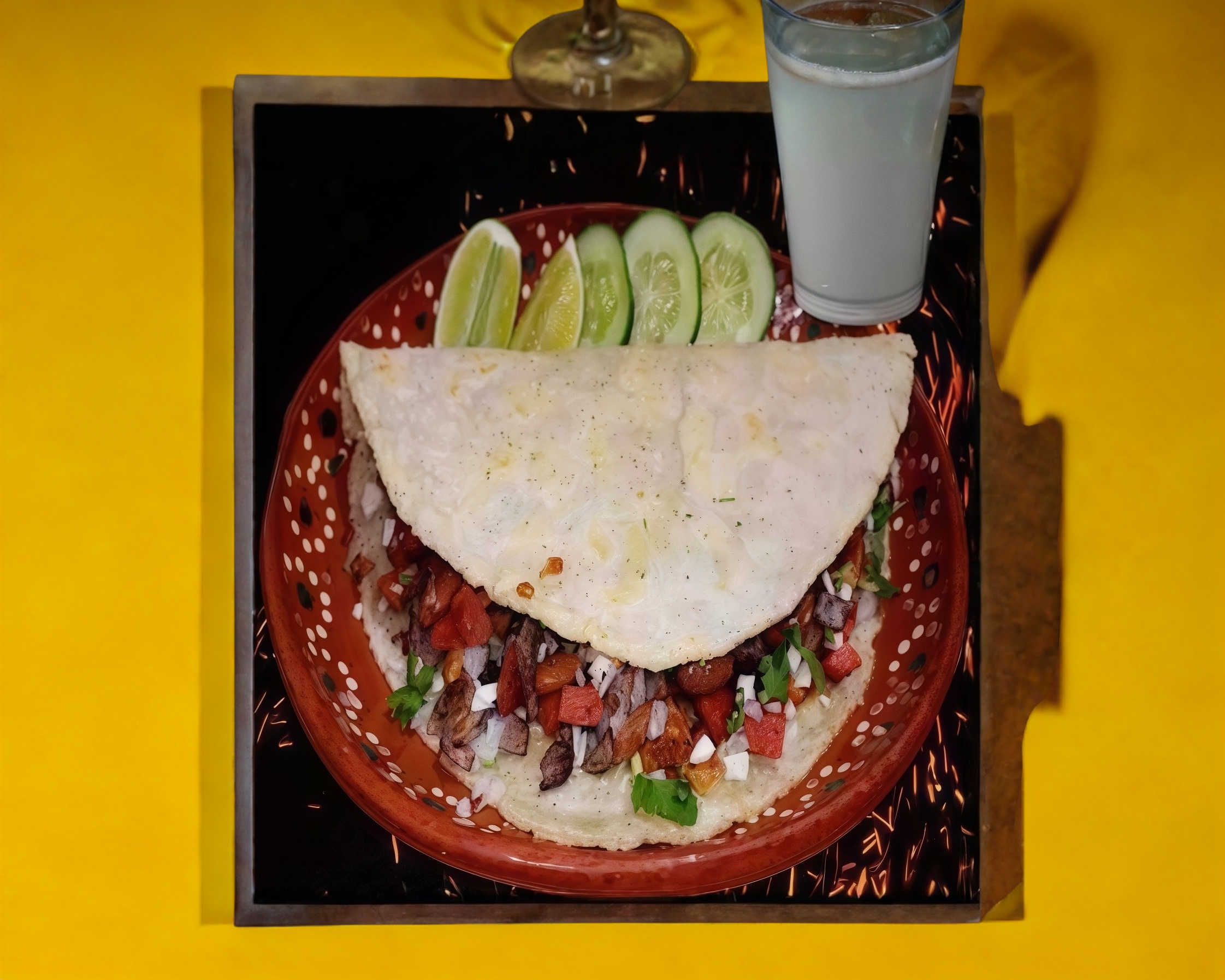 Sope de maíz gigante con una cama de frijolitos fritos, la o las proteínas que tu elijas con cebolla, cilantro y quesito fresco.
