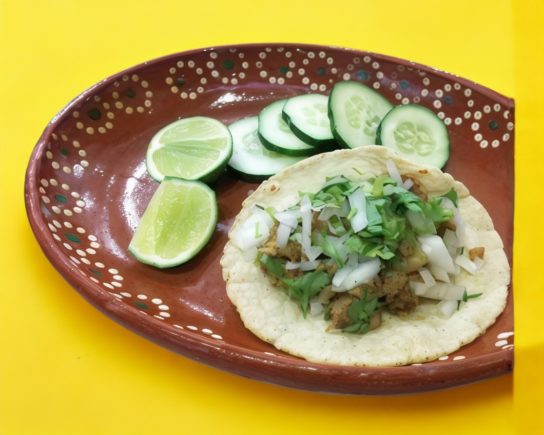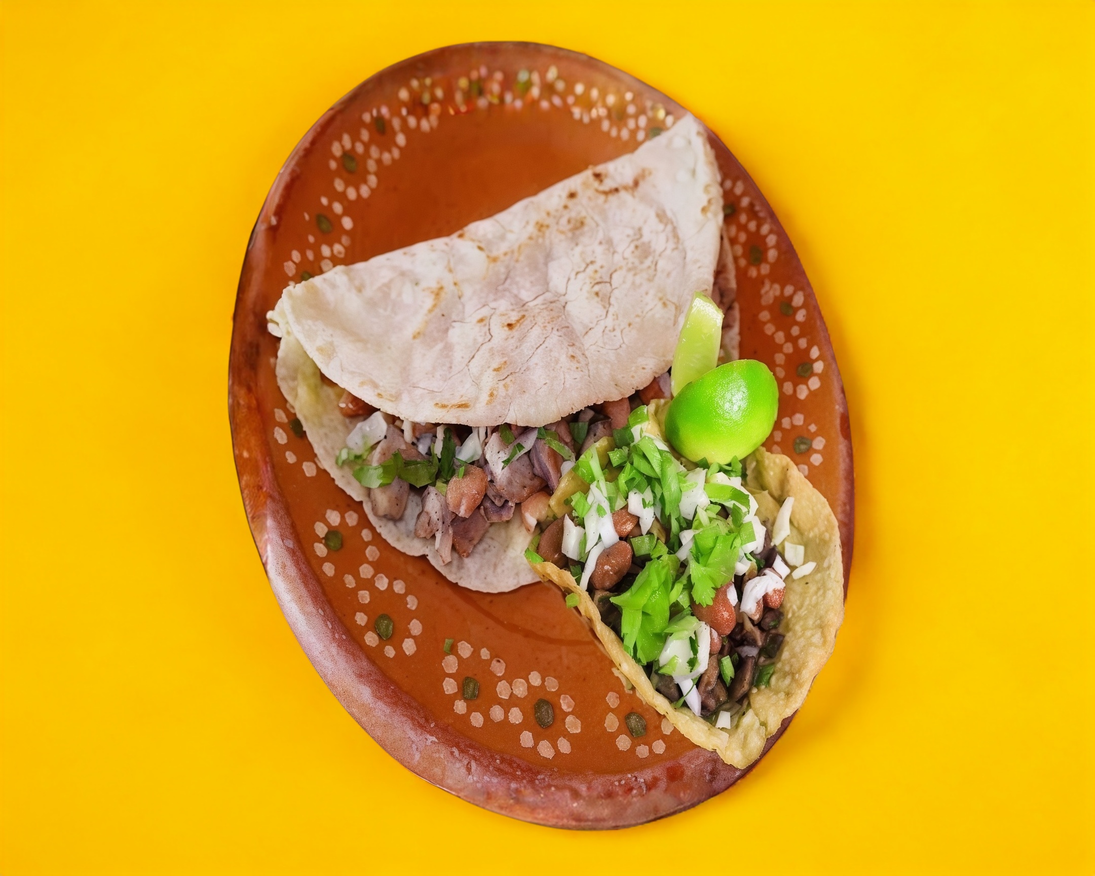 Quesadilla de tortilla de maíz, recién torteada con carne a elección con cebolla cilantro y frijolitos de la olla.
