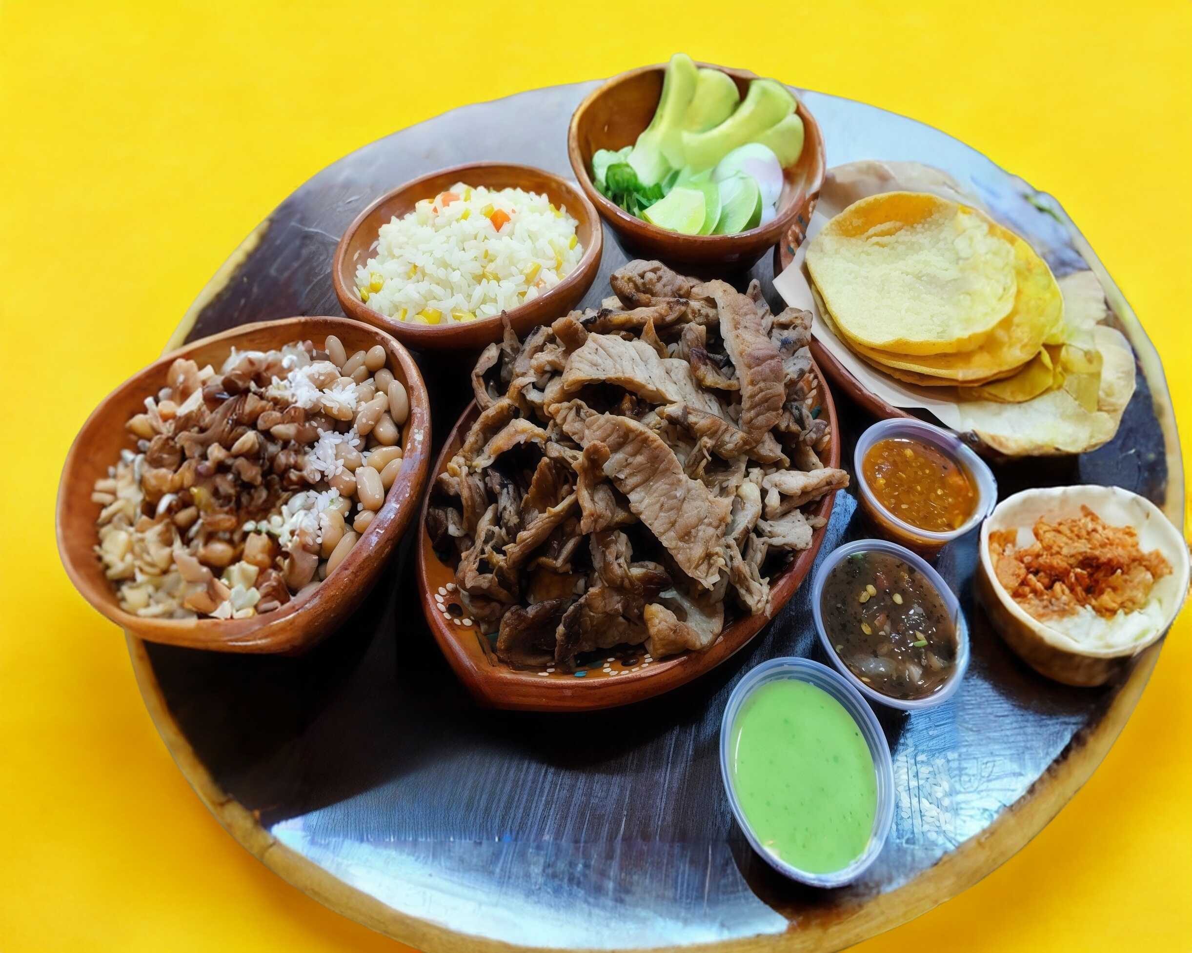 Un kilo de nuestra exquisita carne adobada, frijolitos de la olla, arroz, salsa (martajada de guacamole y mulata), limones, cilantro, cebolla y 10 tortillas recién hechas.