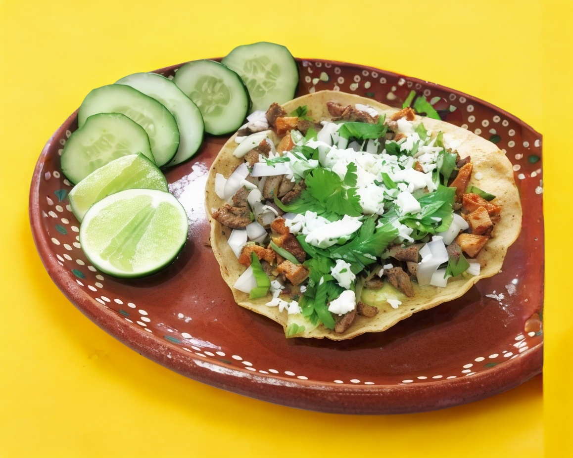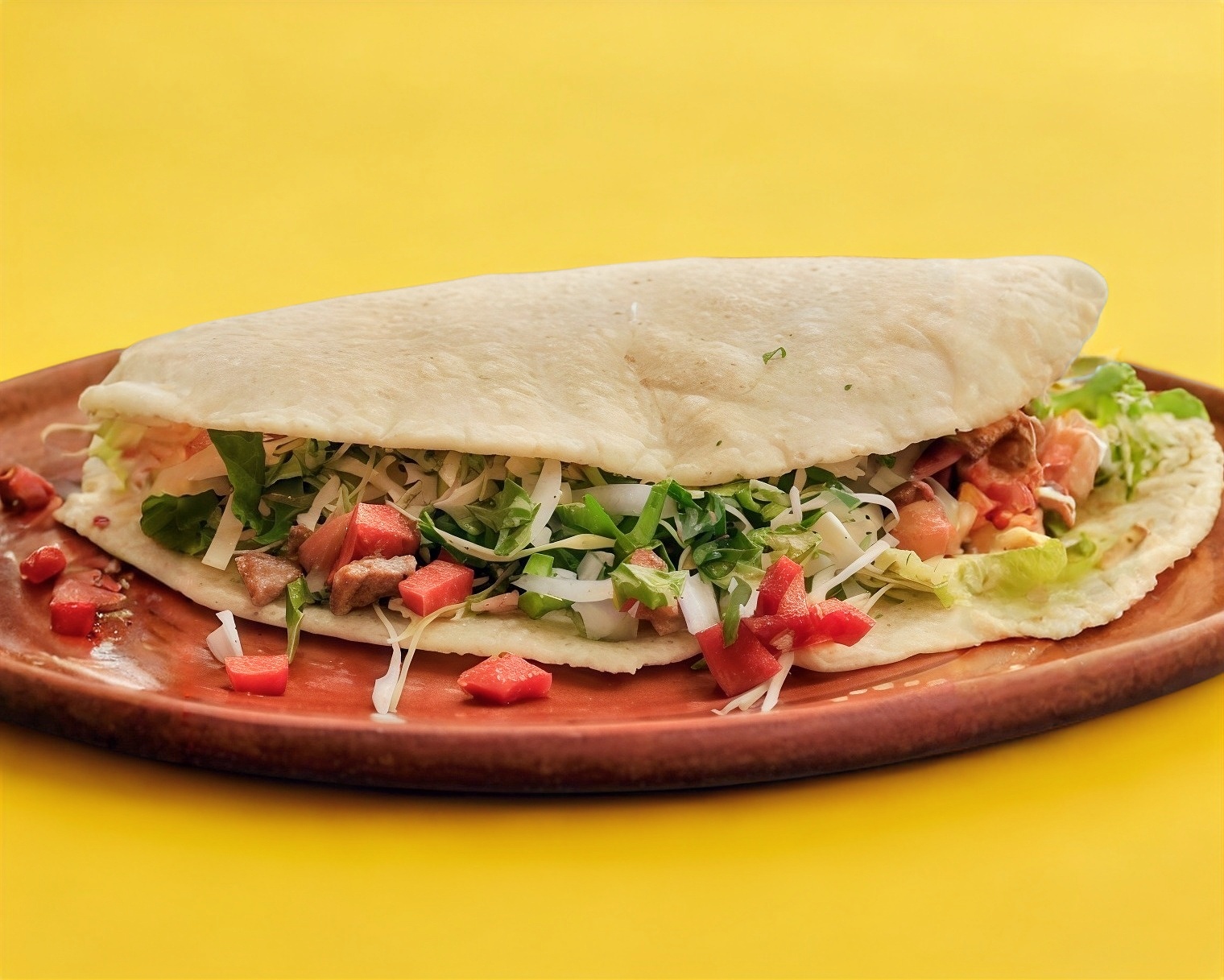 Tortilla de maíz de 30 cm de diámetro, hecha a mano con queso gratinado, carne asada, adobada y chorizo con cebolla cilantro, frijoles y col.