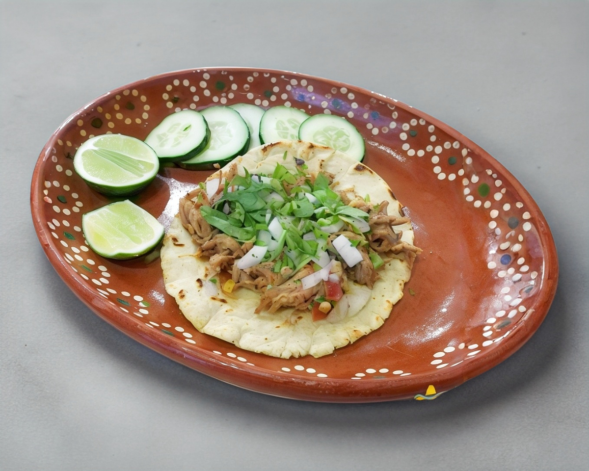 Tortilla de maíz de 30 cm de diámetro, hecha a mano con queso gratinado, carne asada, adobada y chorizo con cebolla cilantro, frijoles y col.