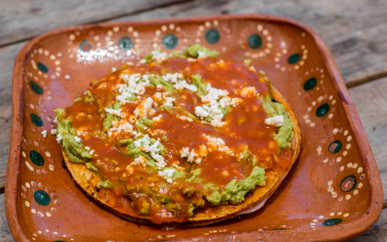 Tortilla Trad., maíz azul y maiz con nopal, salsa roja, verde y suiza, pollo camarón y arrachera.
