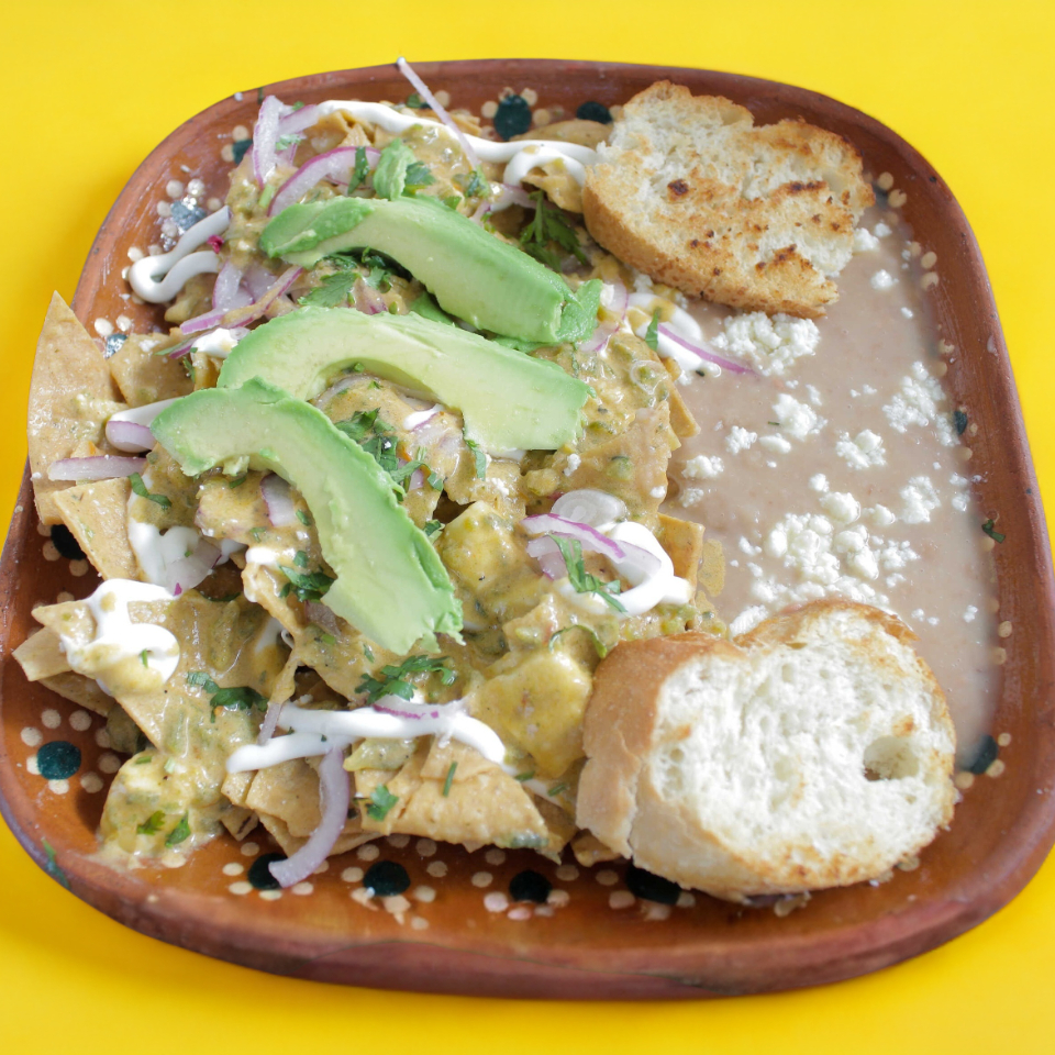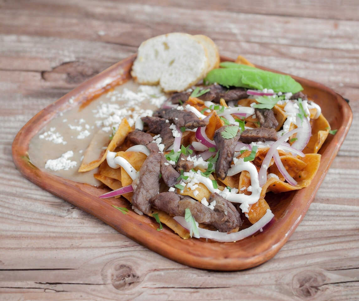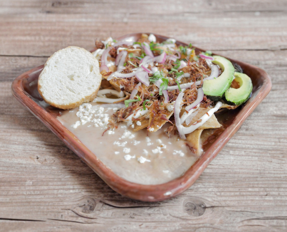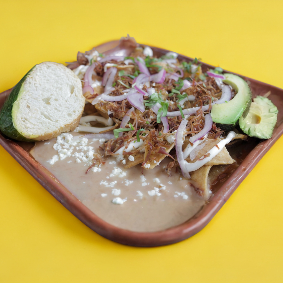 Chilaquiles con tiras de pollo sazonado acompañados de frijoles machacados y aguacate.