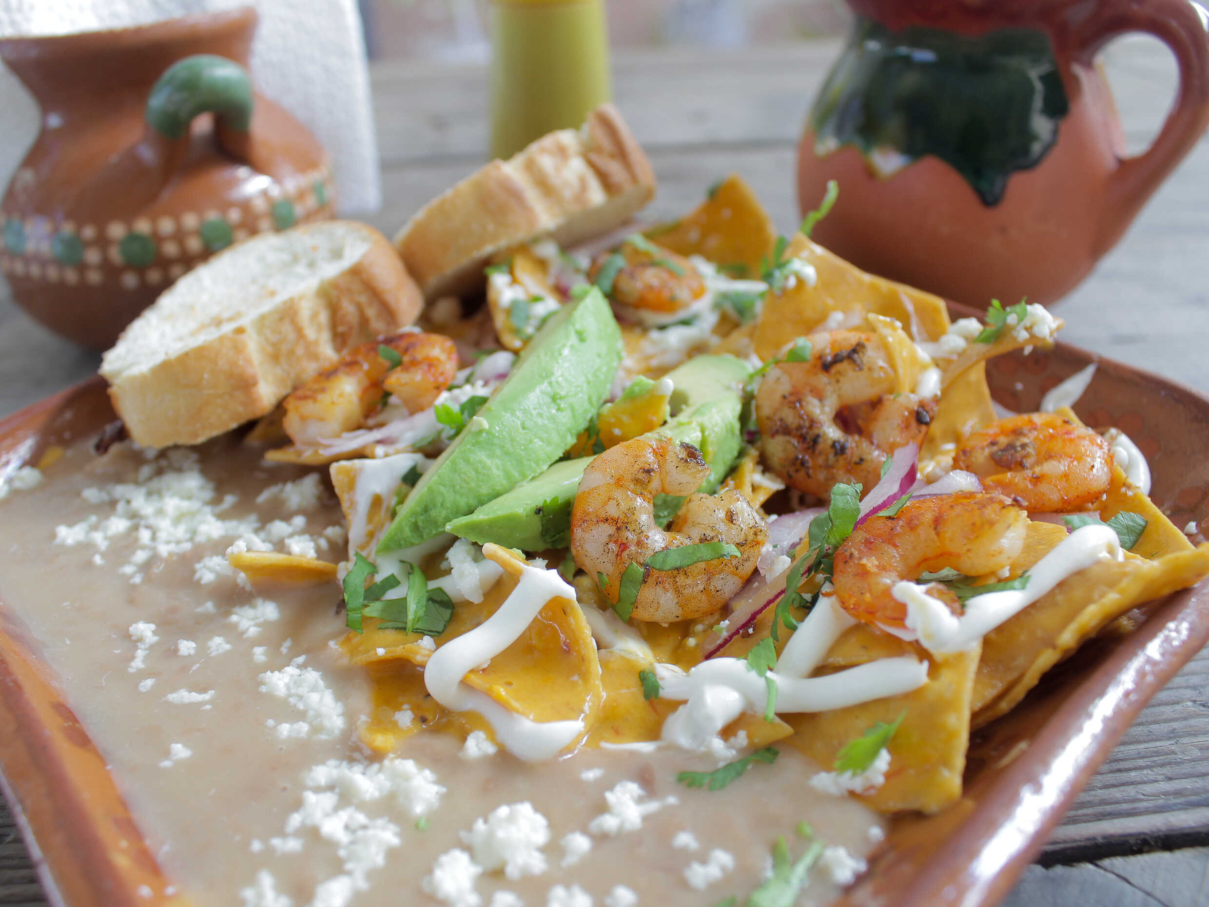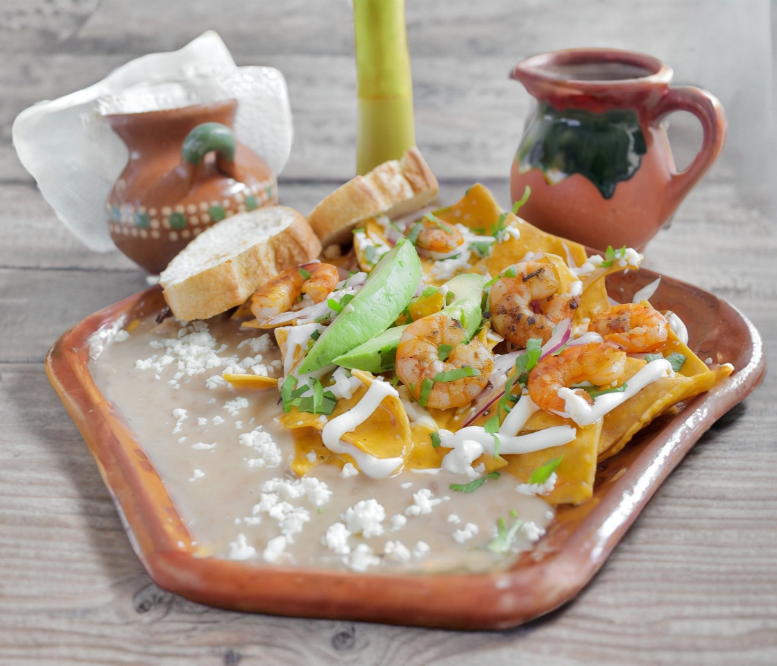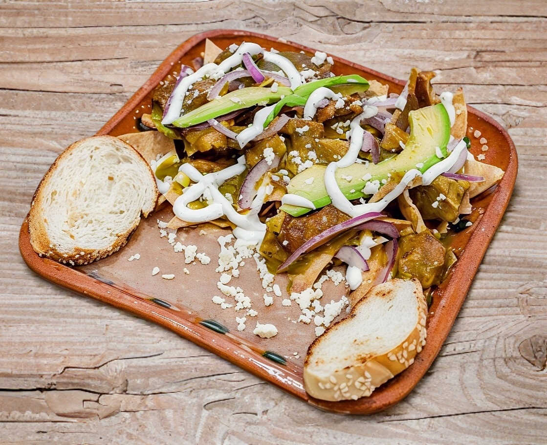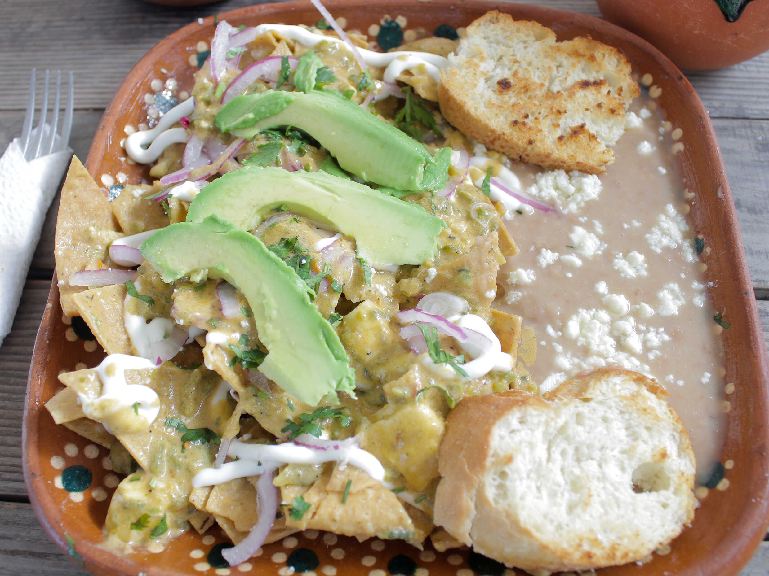 Chilaquiles con tiras de pollo sazonado acompañados de frijoles machacados y aguacate.