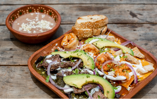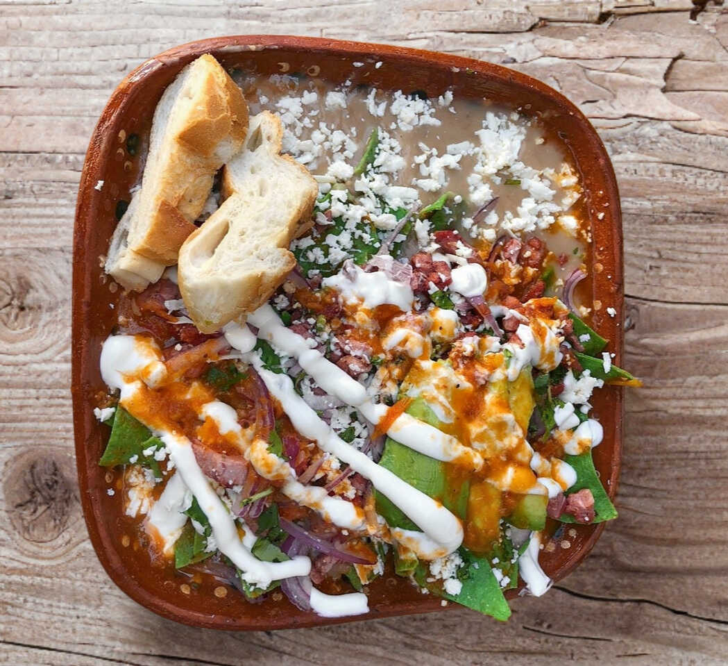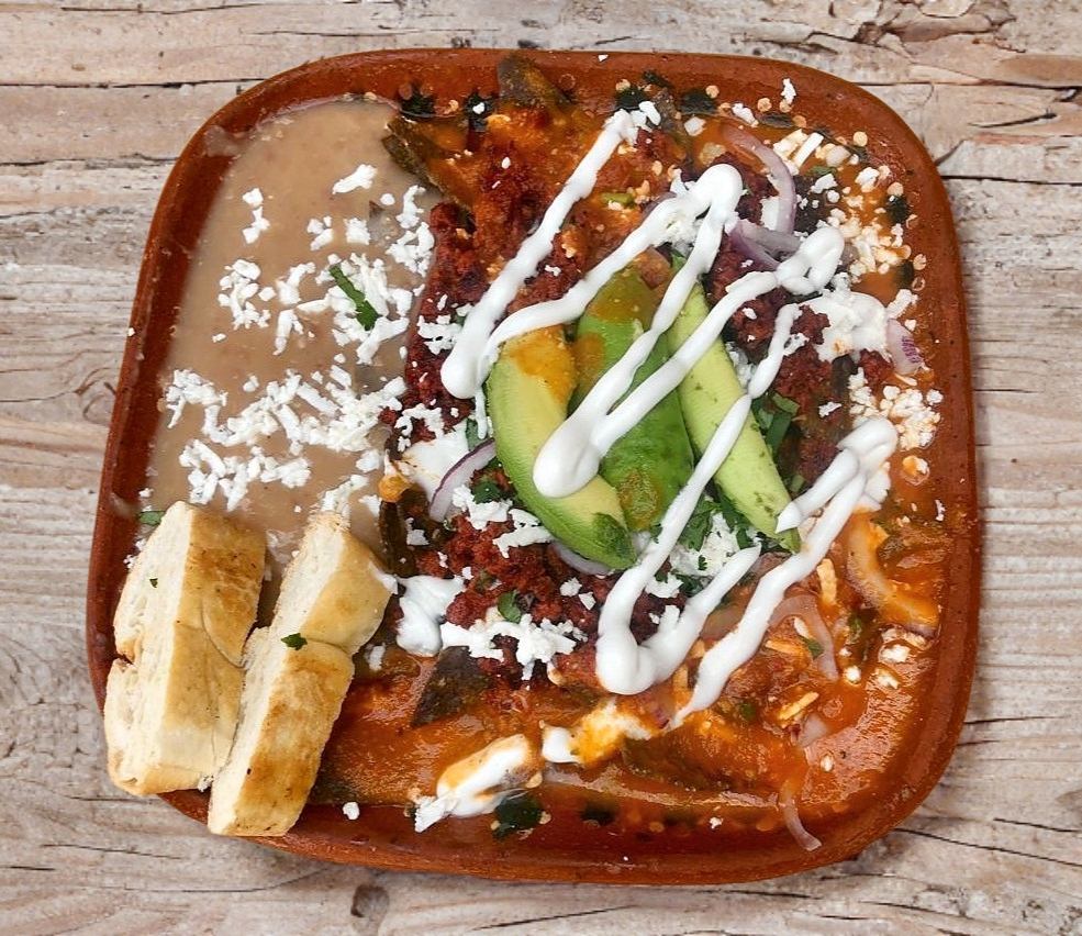 Chilaquiles con machaca de la buena acompañados de frijoles machacados y aguacate