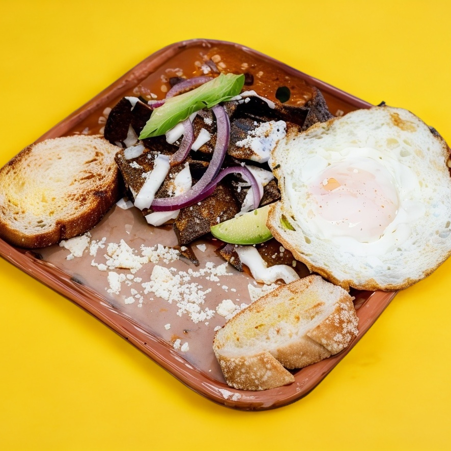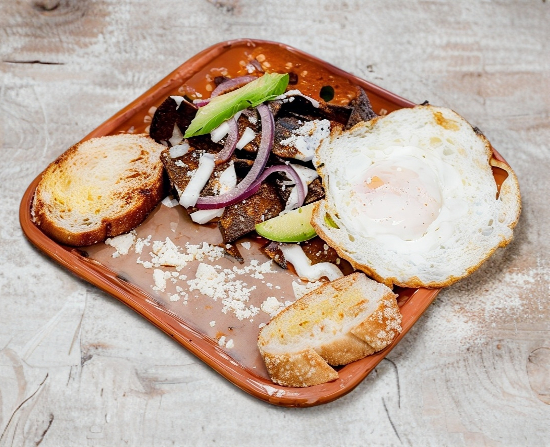 Chilaquiles con huevo estrellado o revuelto acompañados de frijoles machacados y aguacate.