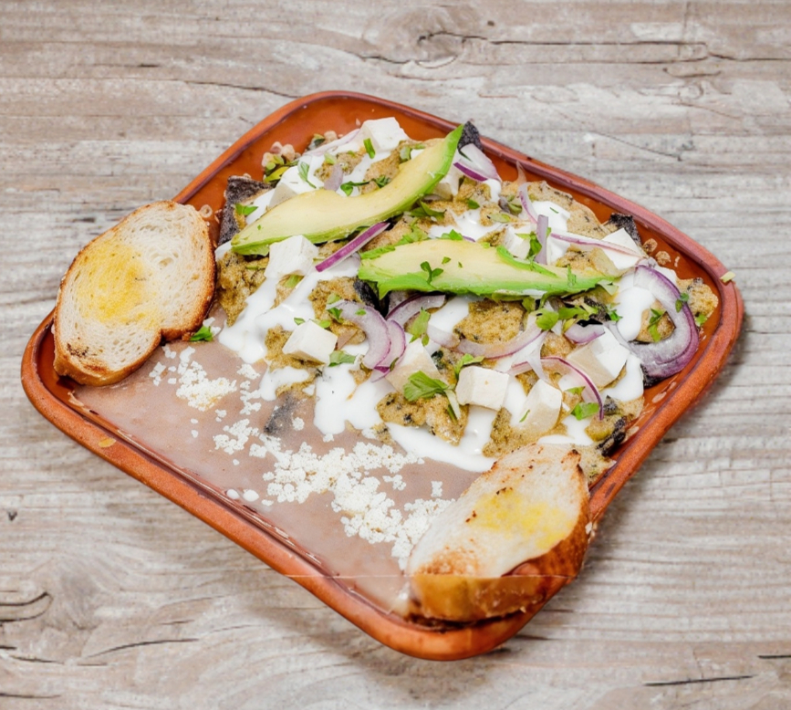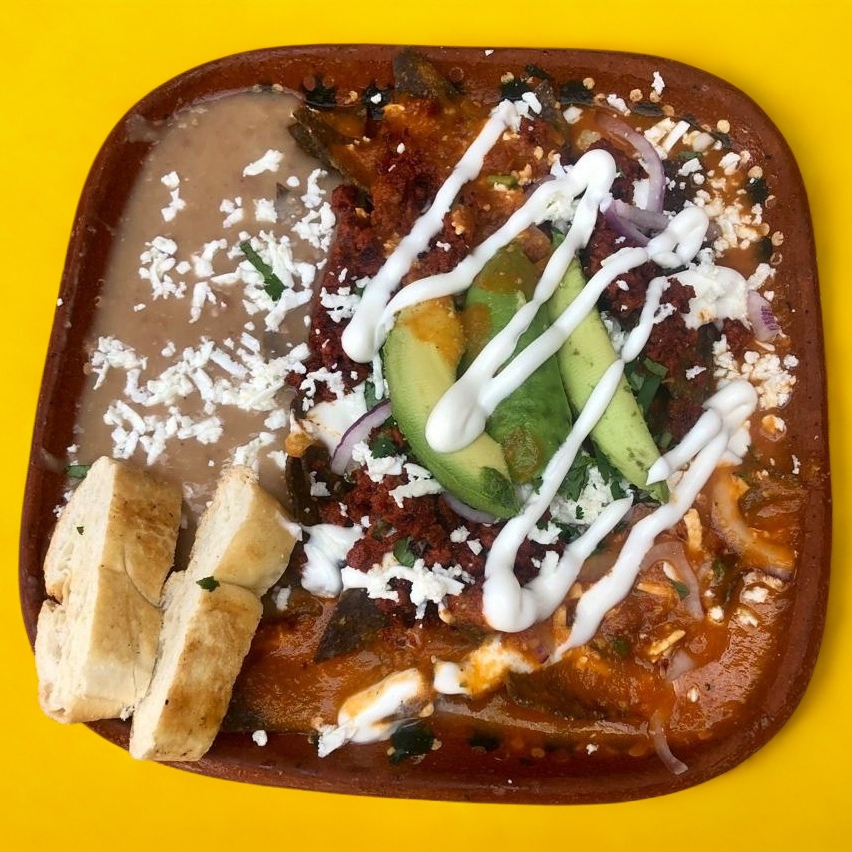 Chilaquiles con chorizo acompañados de frijoles machacados y aguacate.