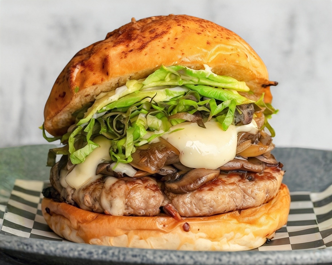 Incluye papas. Carne 180 g , champiñones frescos, cebolla caramelizada, queso gratinado, lechuga y aguacate