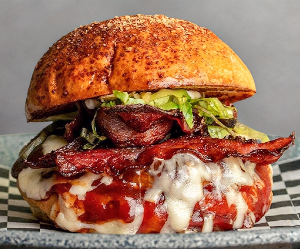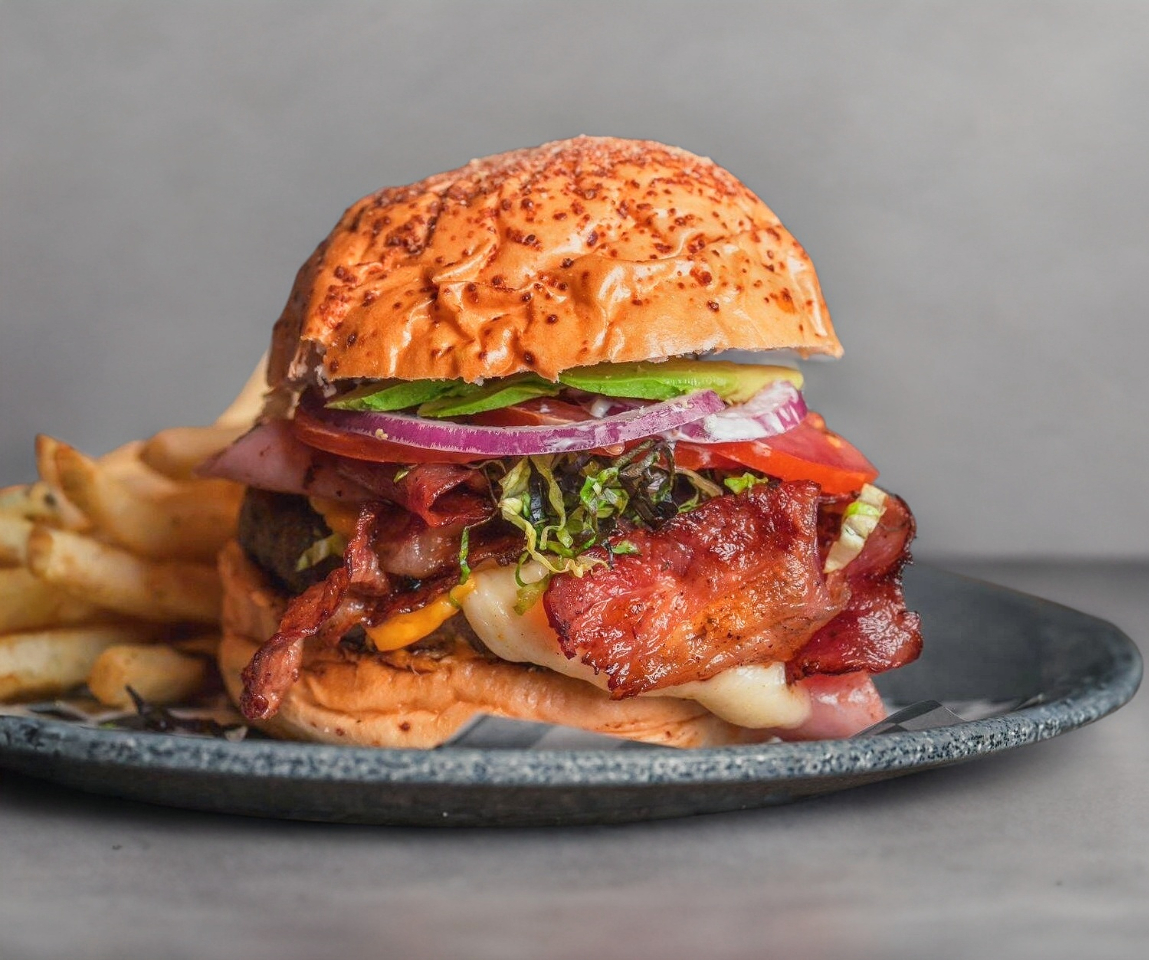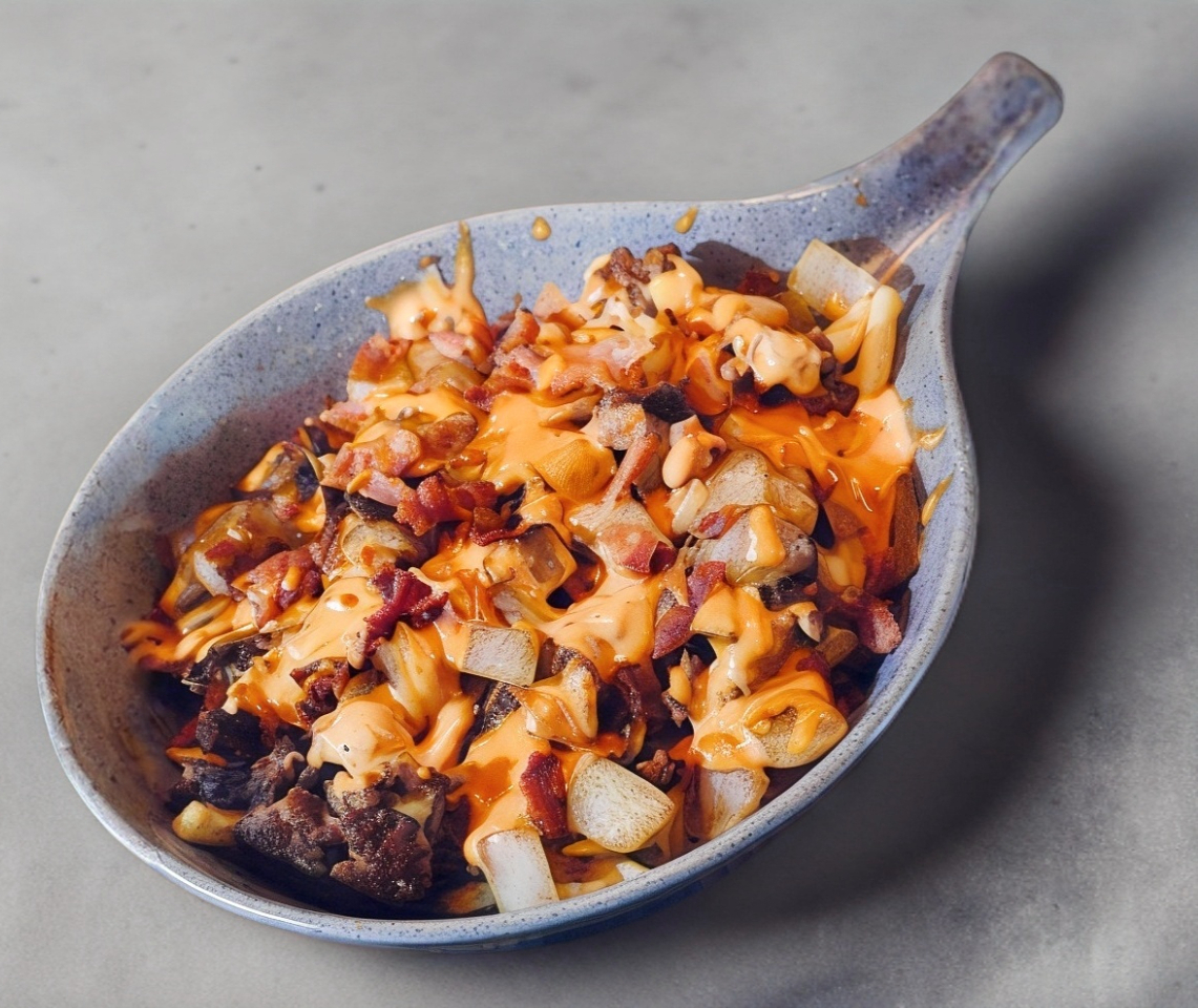 Papas a la francesa con topping de carne de burguer, cebolla, queso gratinado, tocino y chipotle ahumado.