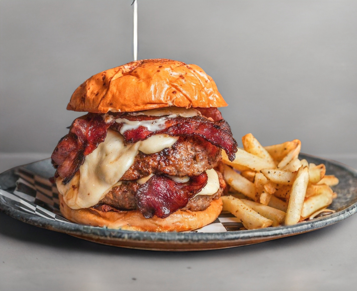 Incluye papas. Doble carne 180g, doble queso gratinado, doble tocino
