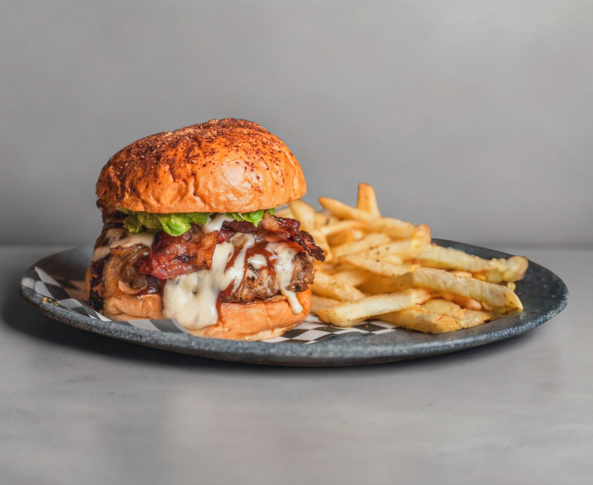 Incluye papas. Carne 180g, cebolla caramelizada, BBQ hot, tocino, queso gratinado y guacamole