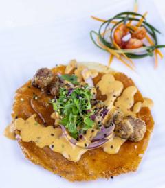CAMARON CRUJIENTE SERVIDO SOBRE TORTILLA DE JICAMA, CORONADO CON PICO DE GALLO CON PIÑA, ACOMPAÑADO DE SALSAS DE LA CASA.