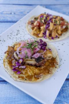 ARRECHERA AL CARBON MONTADO SOBRE TORTILLA DE MAIZ CON LECHUGA, TOMATE, LAMINAS DE AGUACATE Y TOQUE DE CHIMICHURRI.