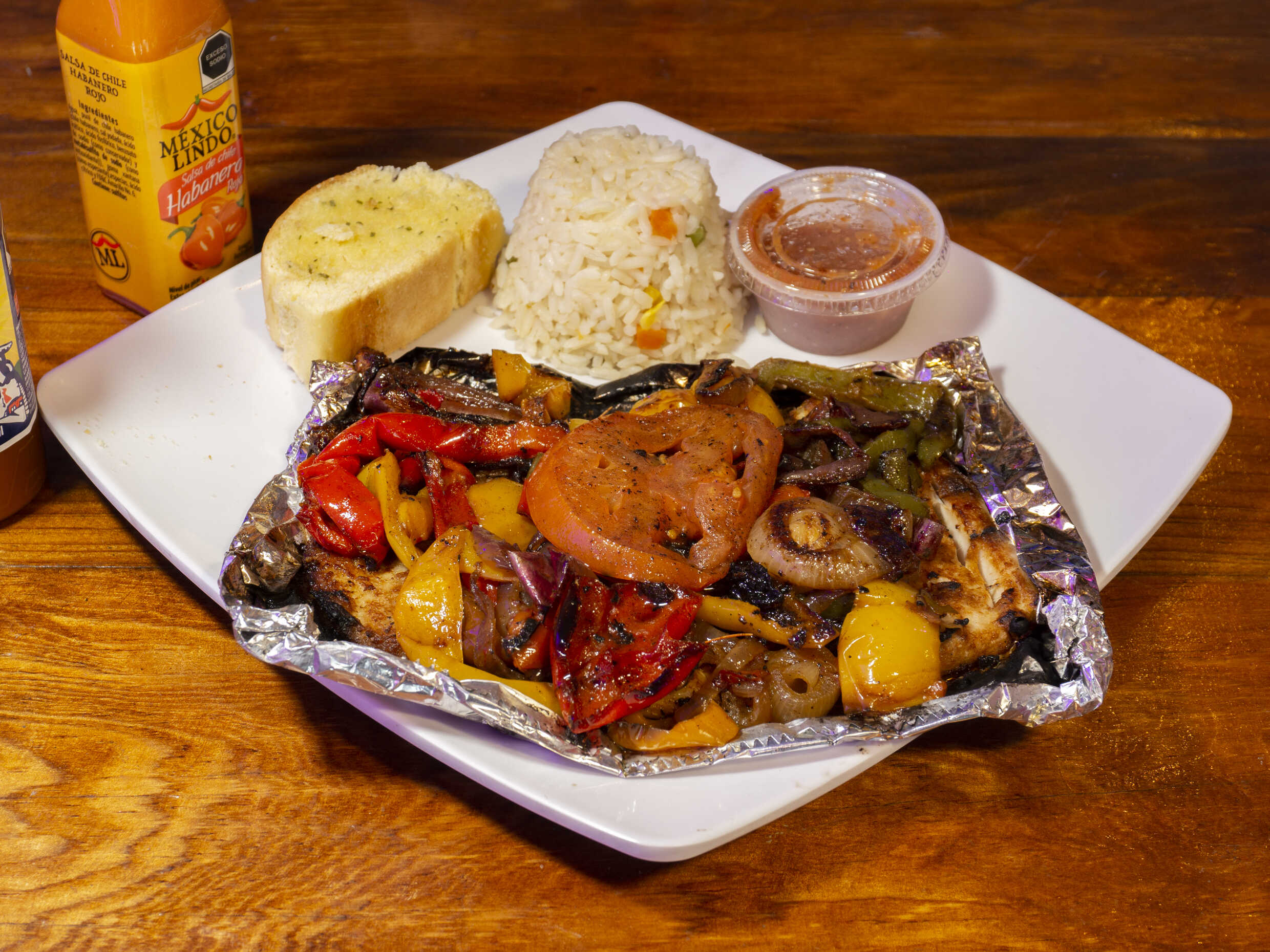 Camarones salteados con jamón, champiñones, pimientos, chipotle, arroz y guarnición.