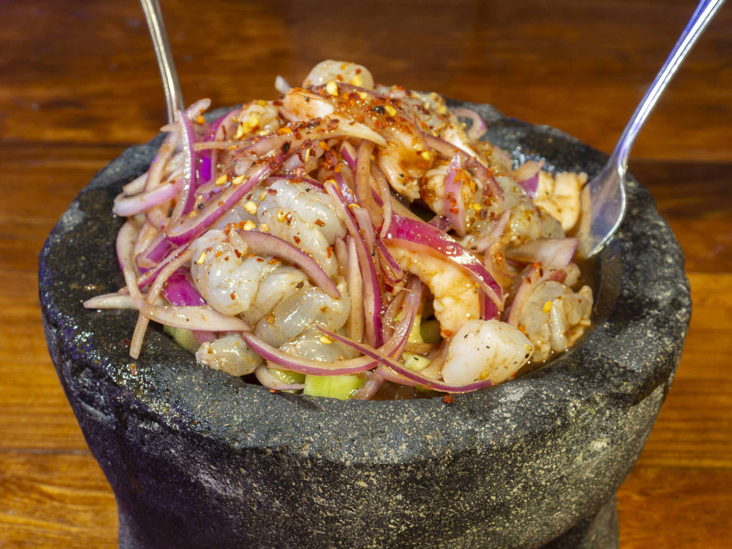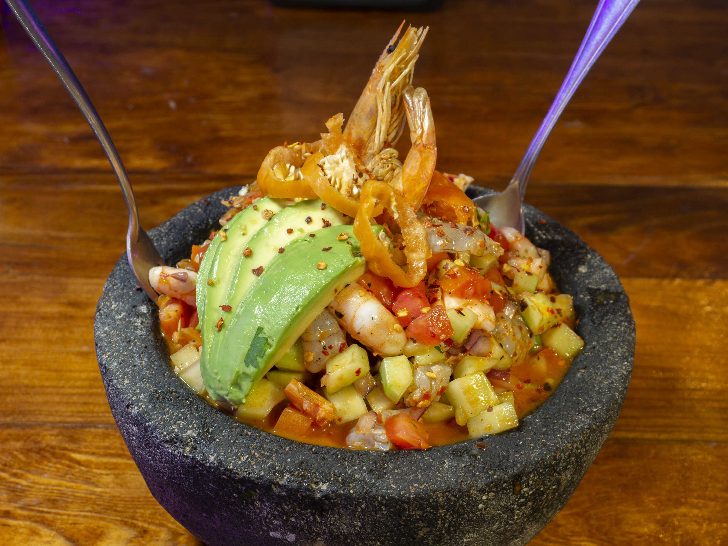 Combinación de mariscos cocidos y crudos, ahogados en salsa de chiles jalapeños, cubos de aguacate, pepino, cebolla, morada, con un toque de chiles secos asados.