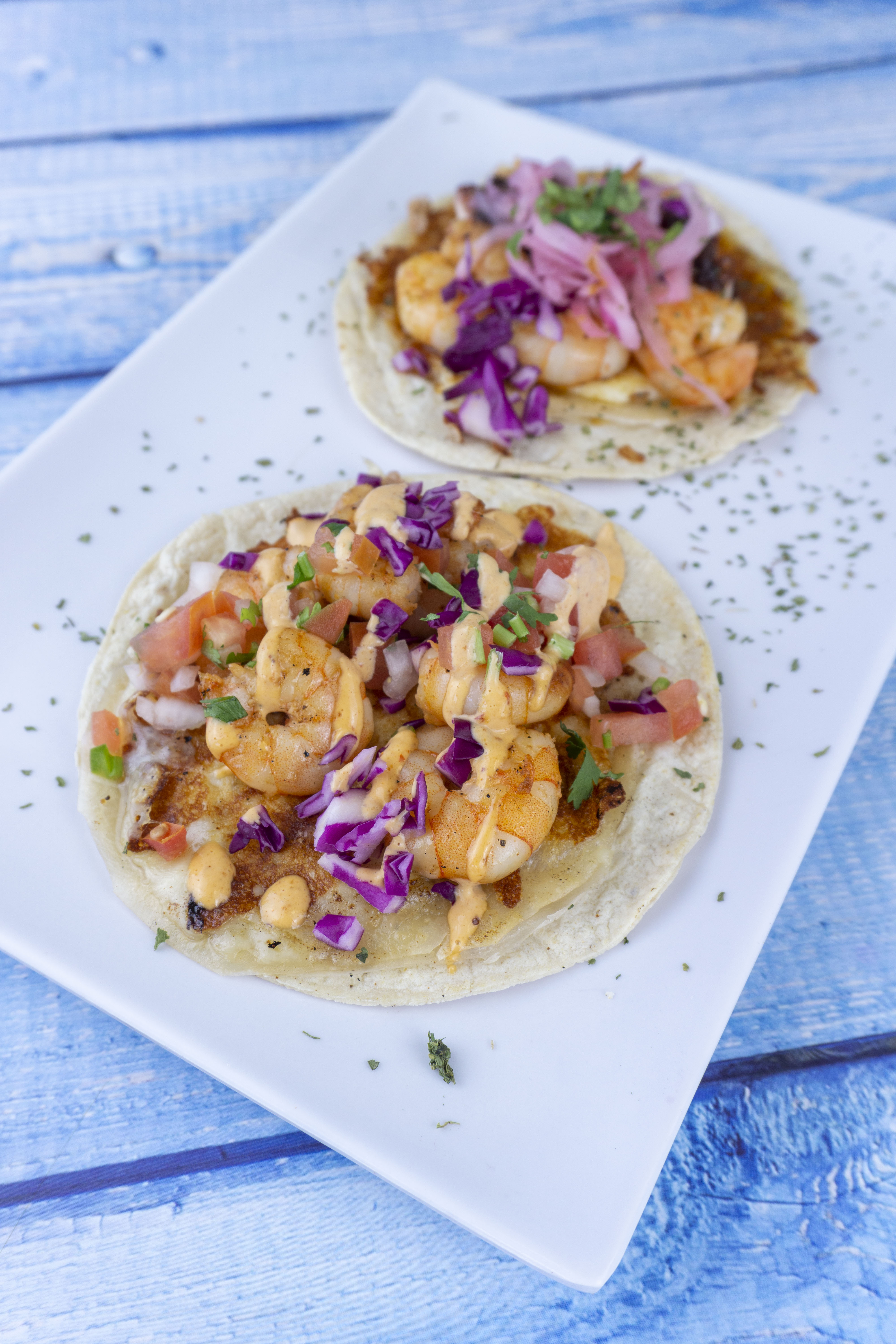 Camarón salteado en aceite, chicharrón de queso, salsa pico de gallo, col morada y aderezo de chipotle.