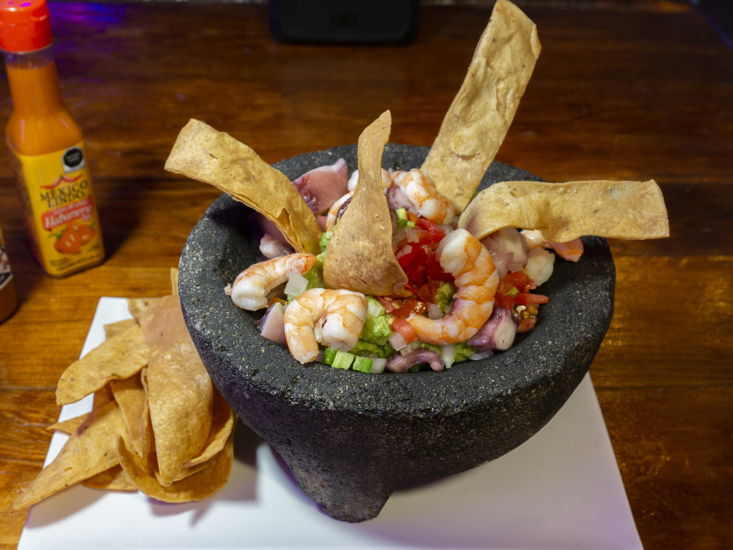 Guacamole con mariscos (camarón y pulpo), cebolla, tomate, chile serrano fresco y julianas de maíz.