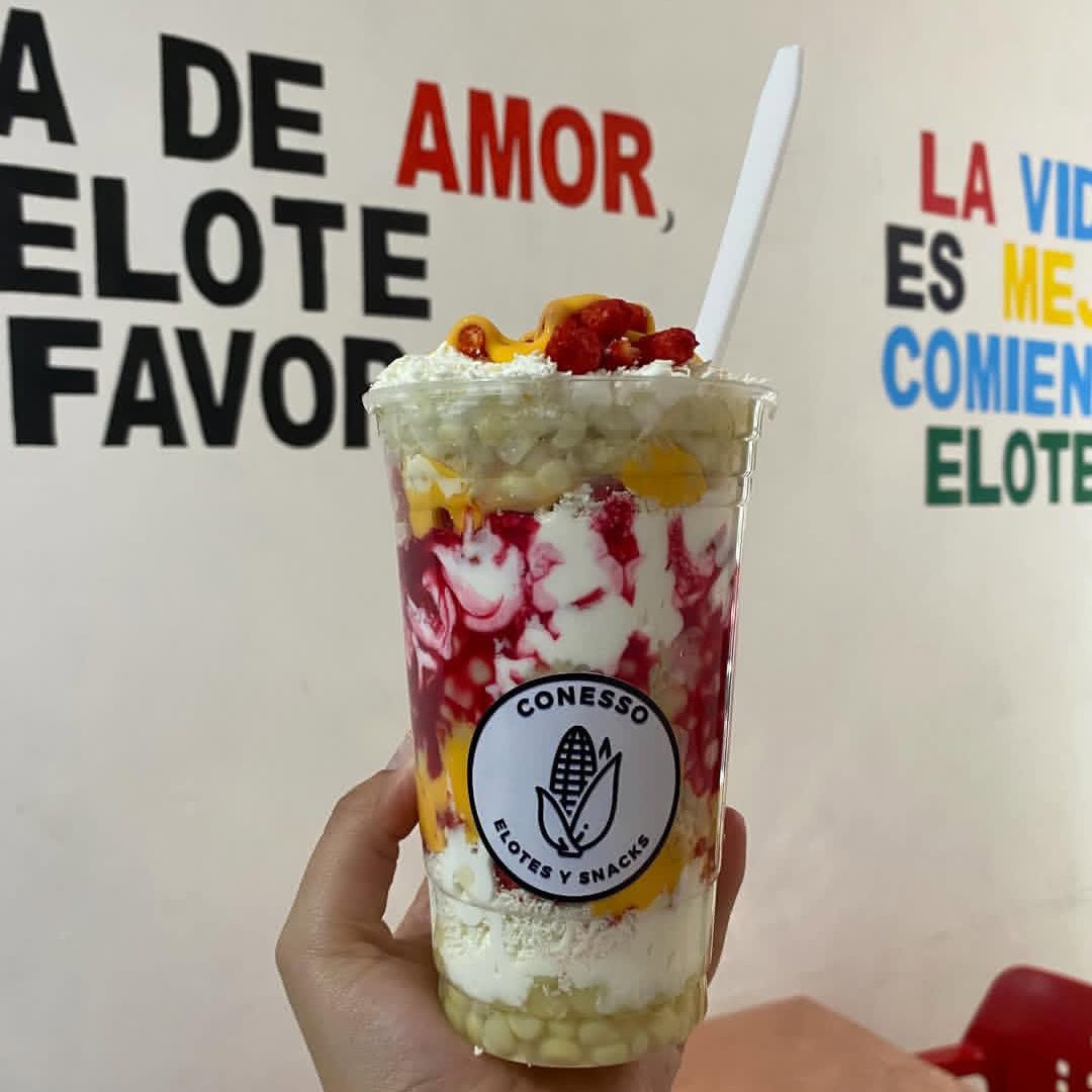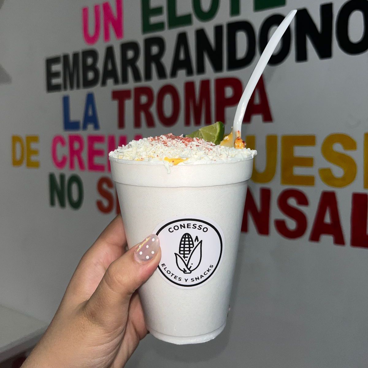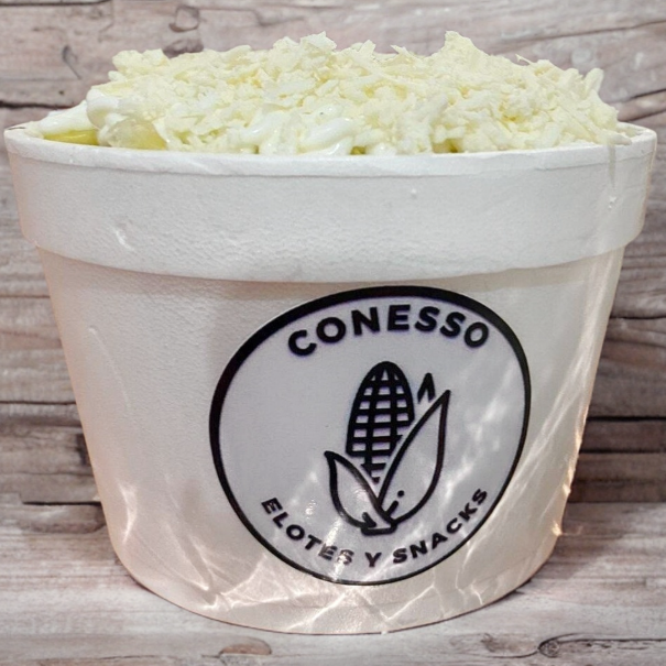 Porción generosa de elote tierno desgranado con los tradicionales aderezos de la casa.