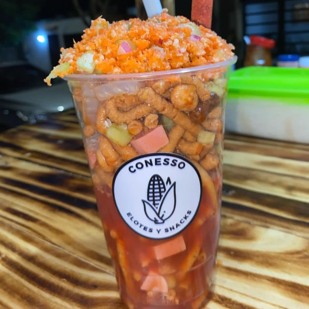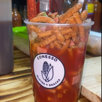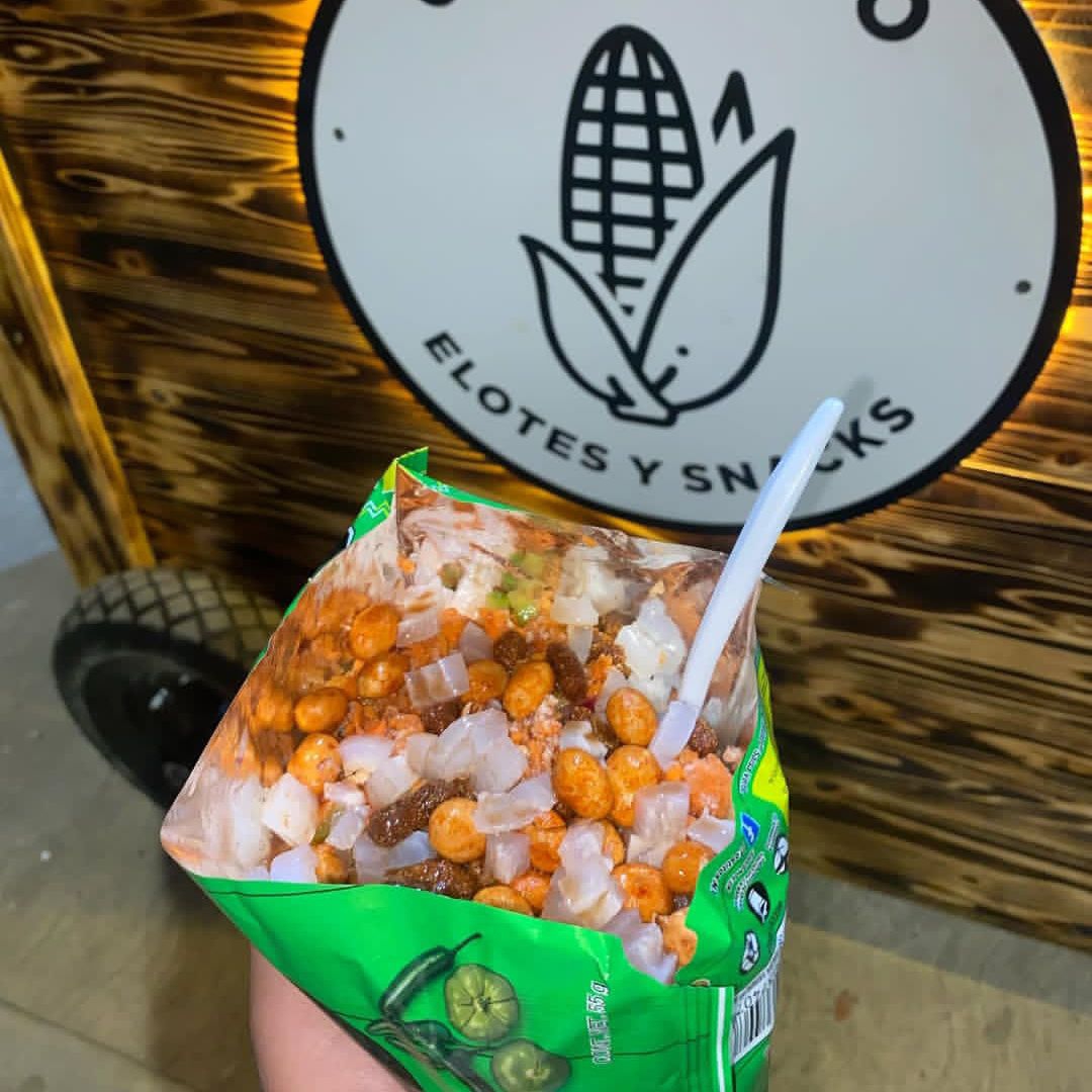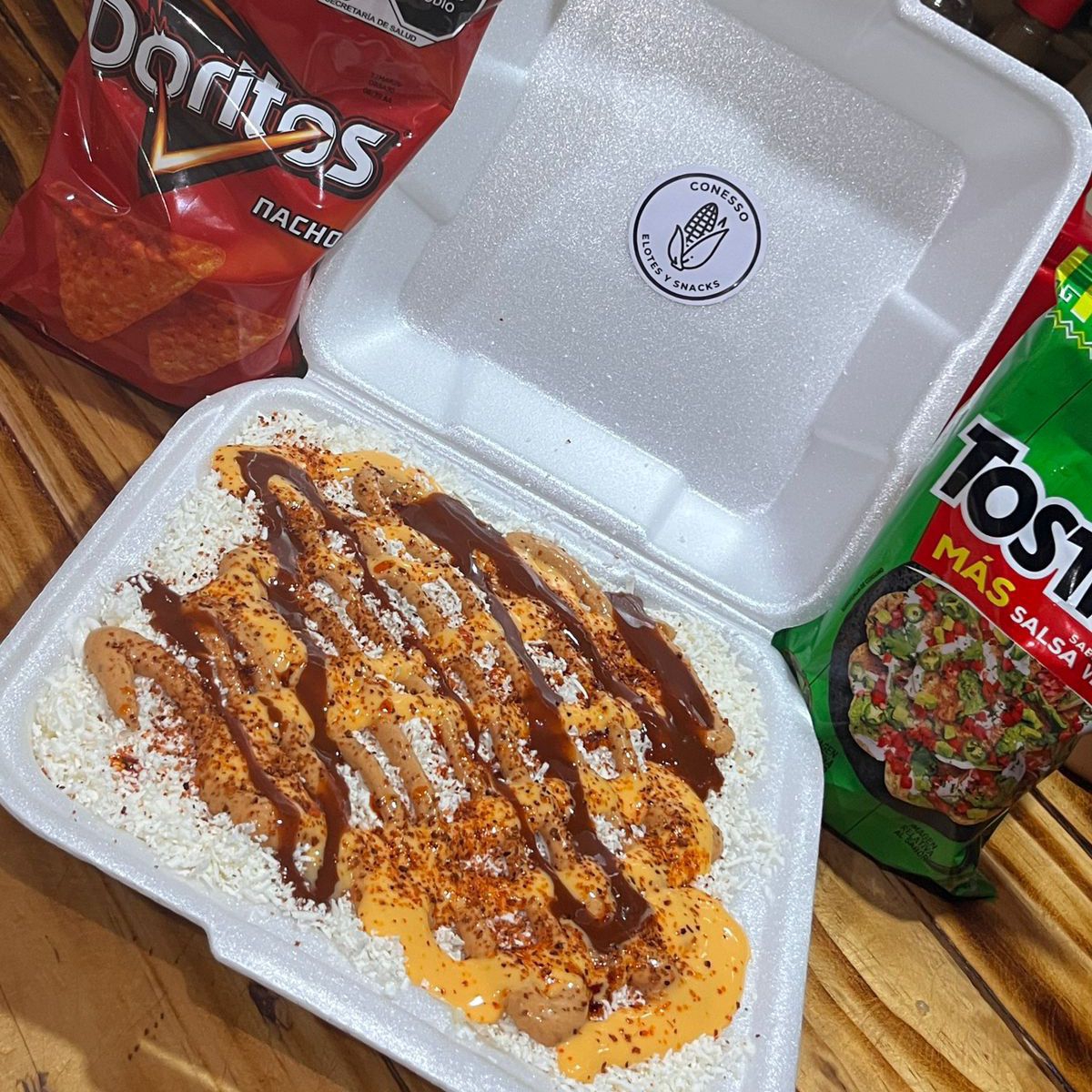 Elote con sabritas a elegir: Tostitos verdes o morados, Doritos nacho o Chetos Fleming Hot.
