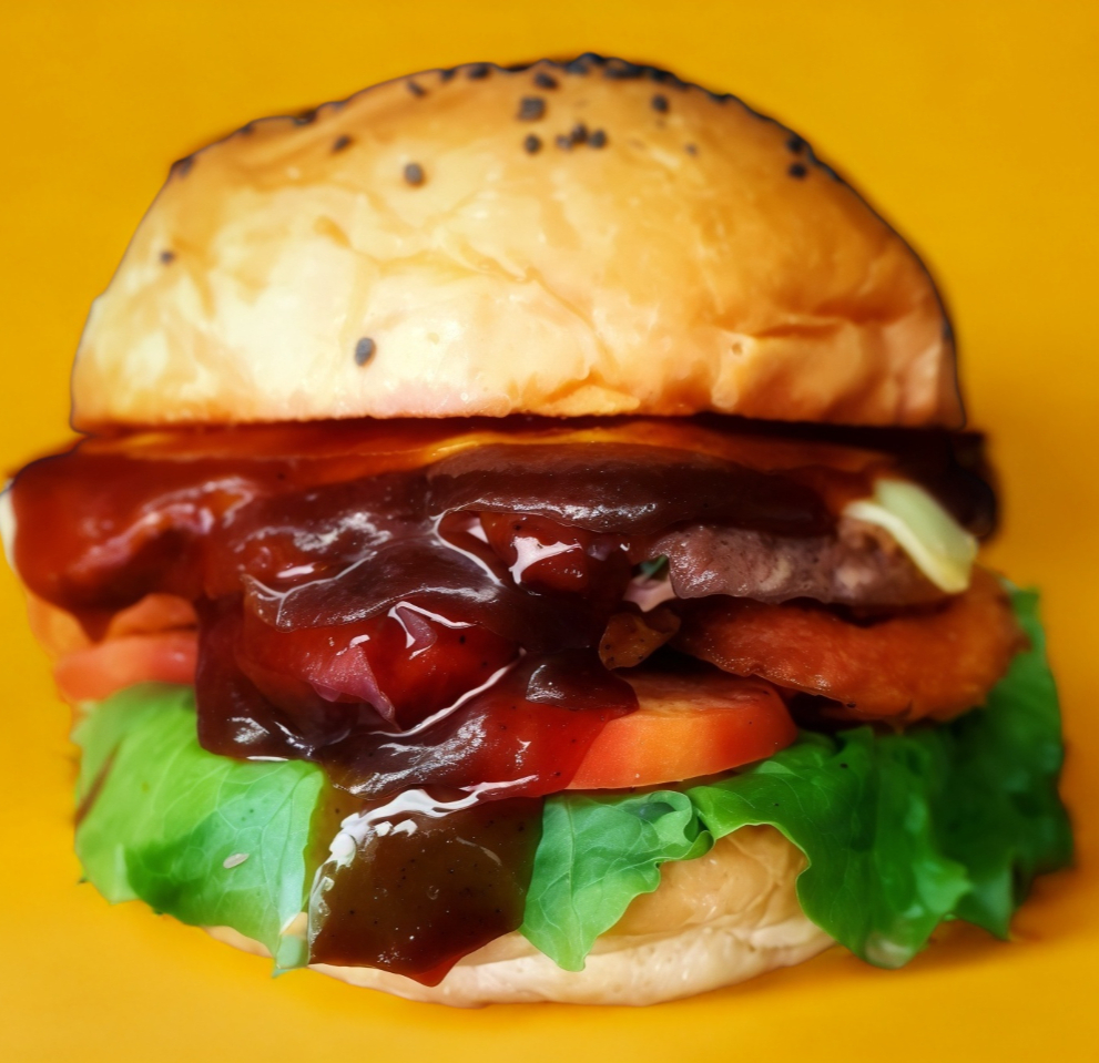 Pan Artesanal, Carne bañada en Salsa BBQ, Lechuga, Tomate, Aros de Cebolla. Incluye papas a la francesa
