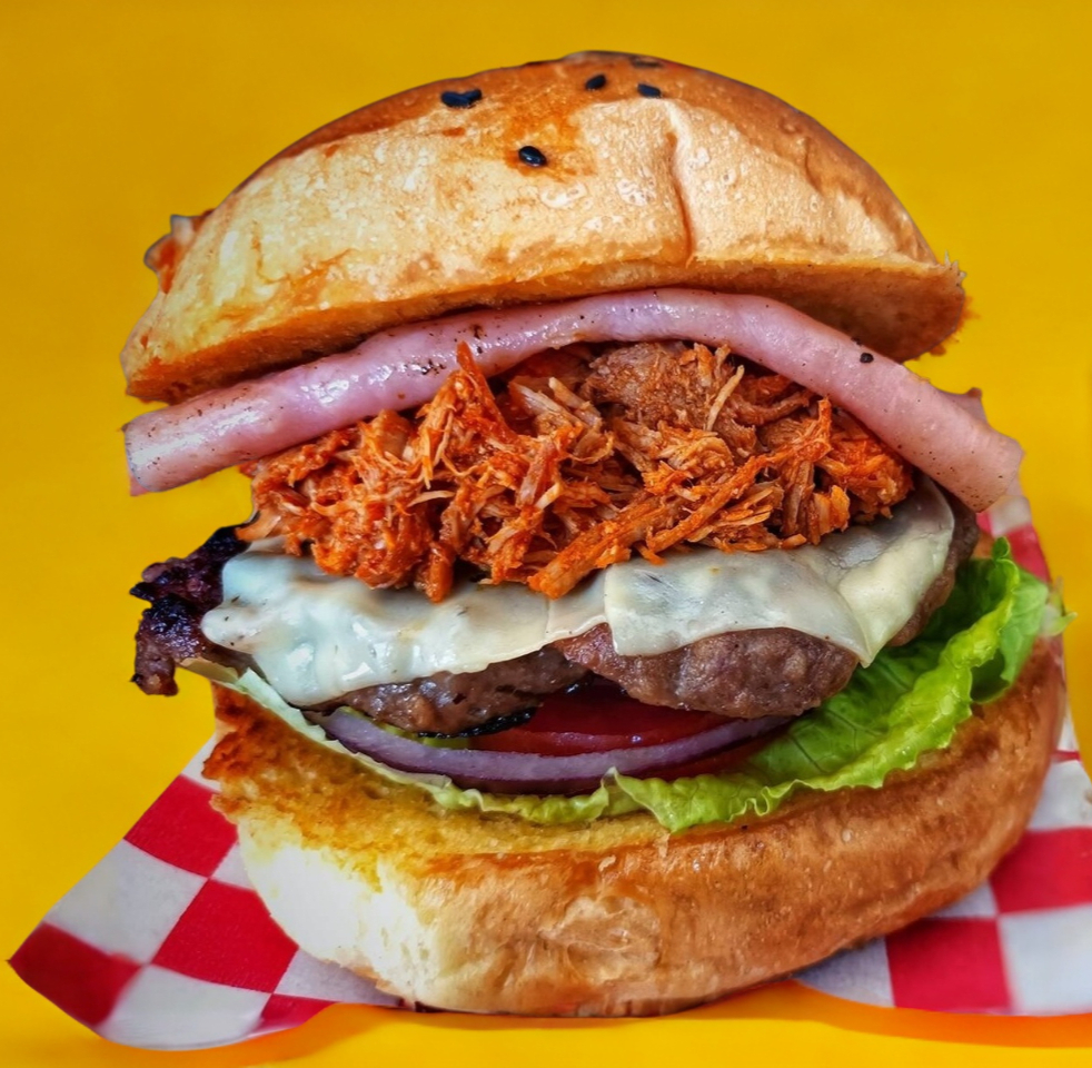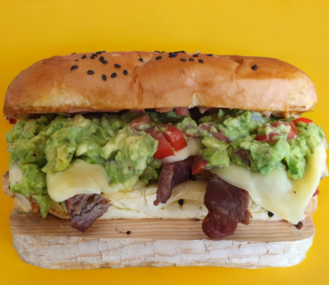 Pan artesanal, carne, jamón, tocino, champiñones, queso manchego, guacamole, lechuga, tomate, cebolla caramelizada. Incluye papas a la francesa