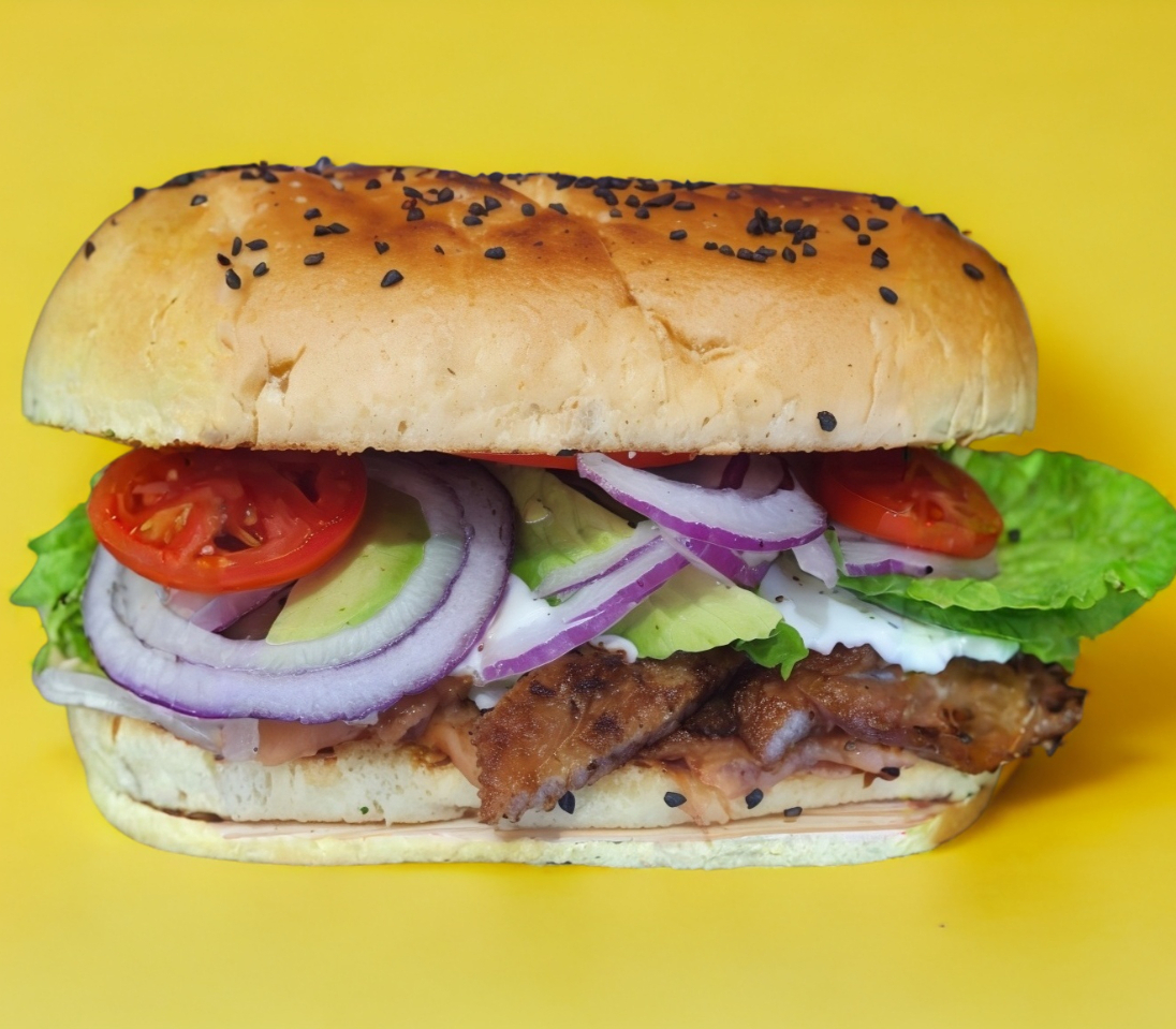 Pan artesanal, pierna, lechuga, tomate, cebolla, aguacate, aderezo chipotle. Incluye papas a la francesa