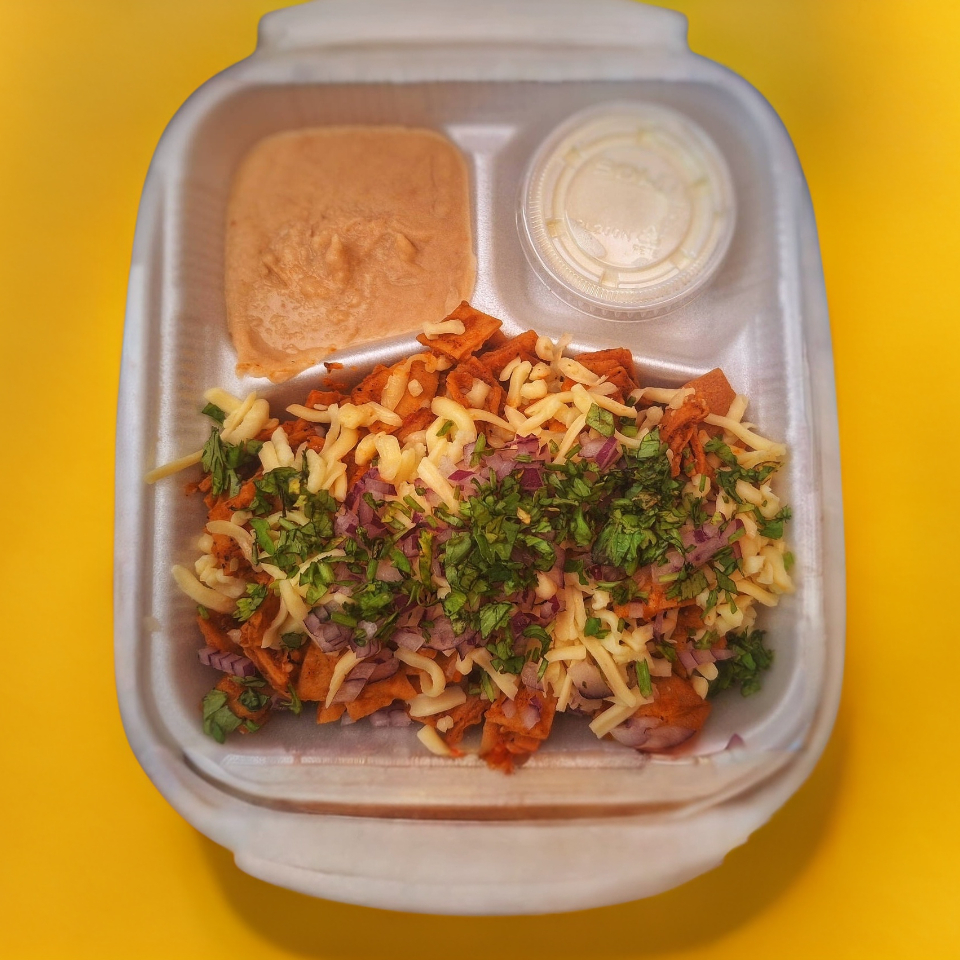 Tortilla, Salsa Roja, Queso, Cebolla, Cilantro, Crema y Frijoles