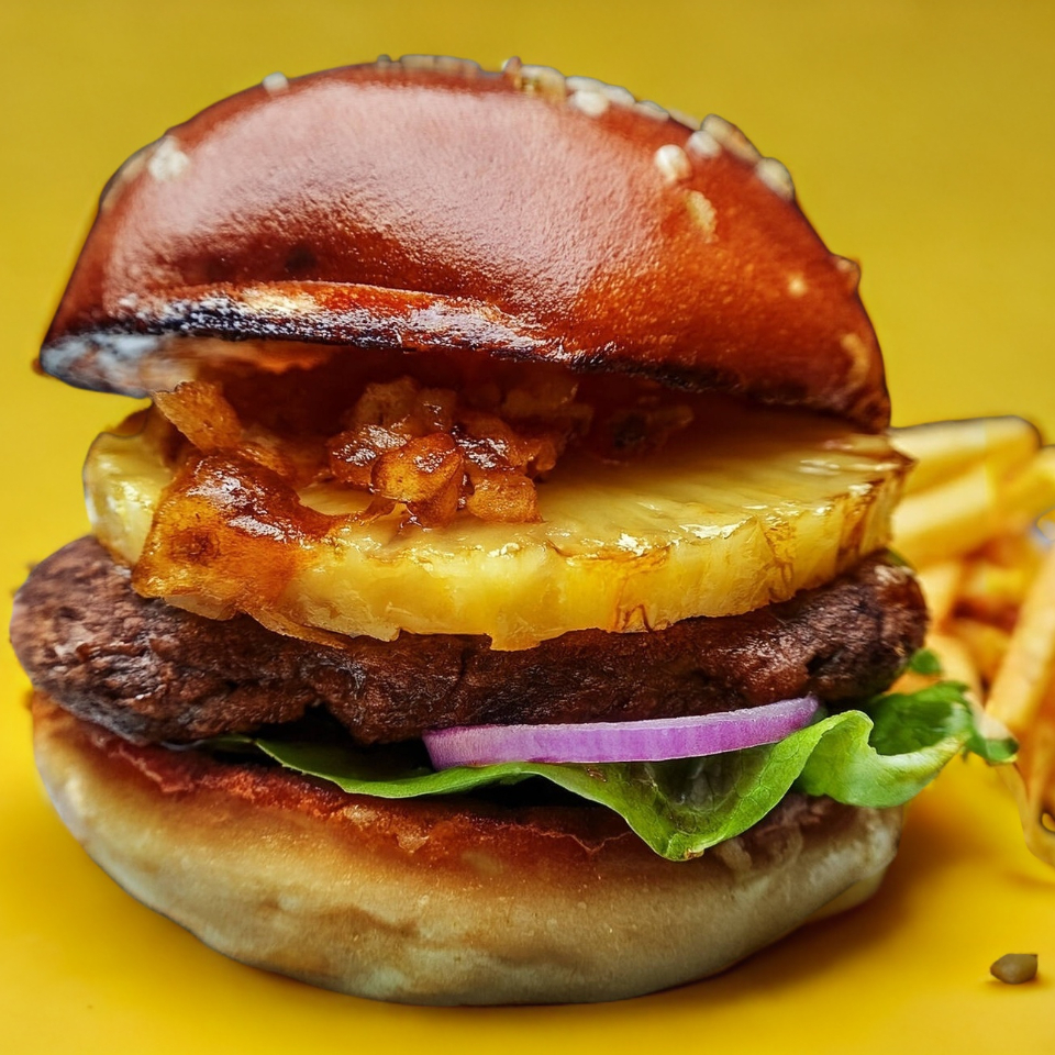 Pan artesanal, carne, piña, lechuga, tomate, cebolla caramelizada, aderezo chipotle. Incluye papas a la francesa