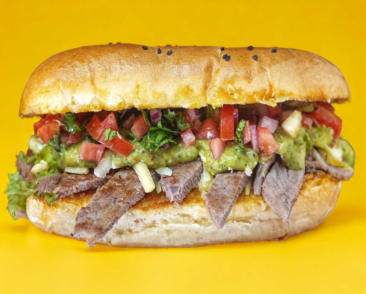 Pan artesanal, Carne Asada, Queso Chihuahua, Guacamole, Salsa Tatemada