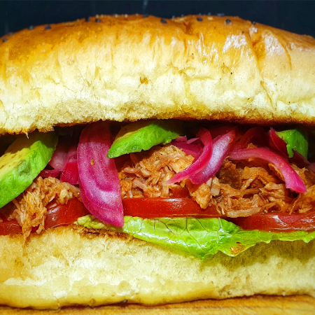 Pan artesanal, cochinita pibil, aguacate, cebolla, chile habanero. Incluye papas a la francesa