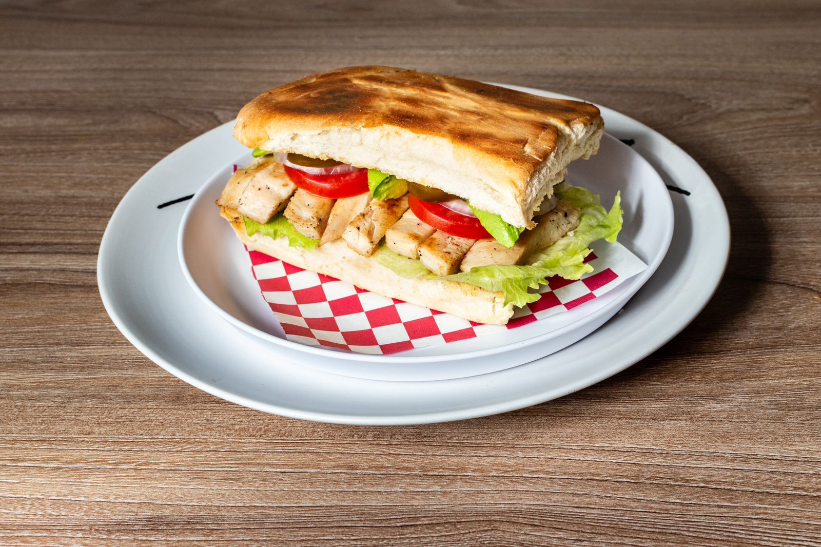 Milanesa de pollo, jamón, pimiento asado, costra de queso y aderezo de la casa.