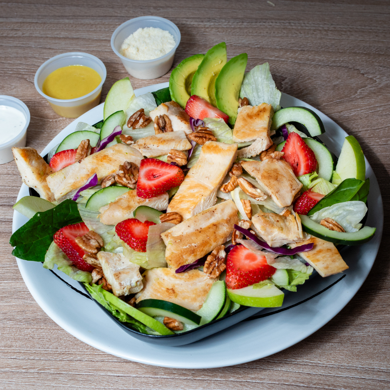 pollo a la plancha, lechuga, espinaca, col morada,pepino, manzana verde, fresa, aguacate, nuez